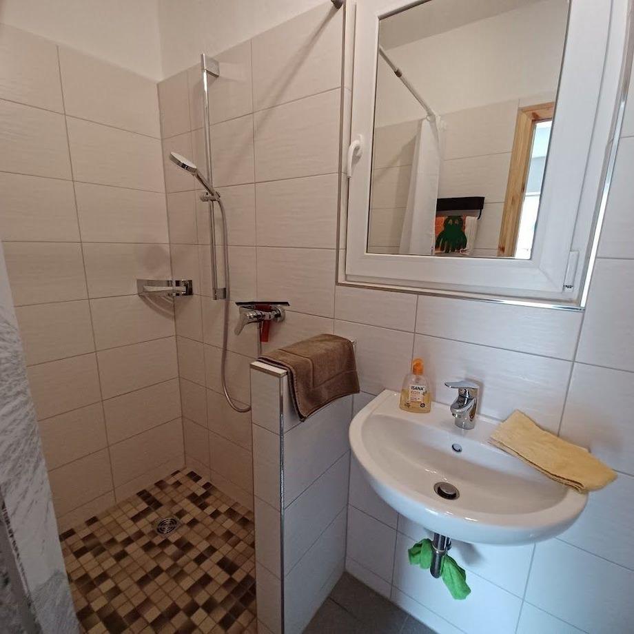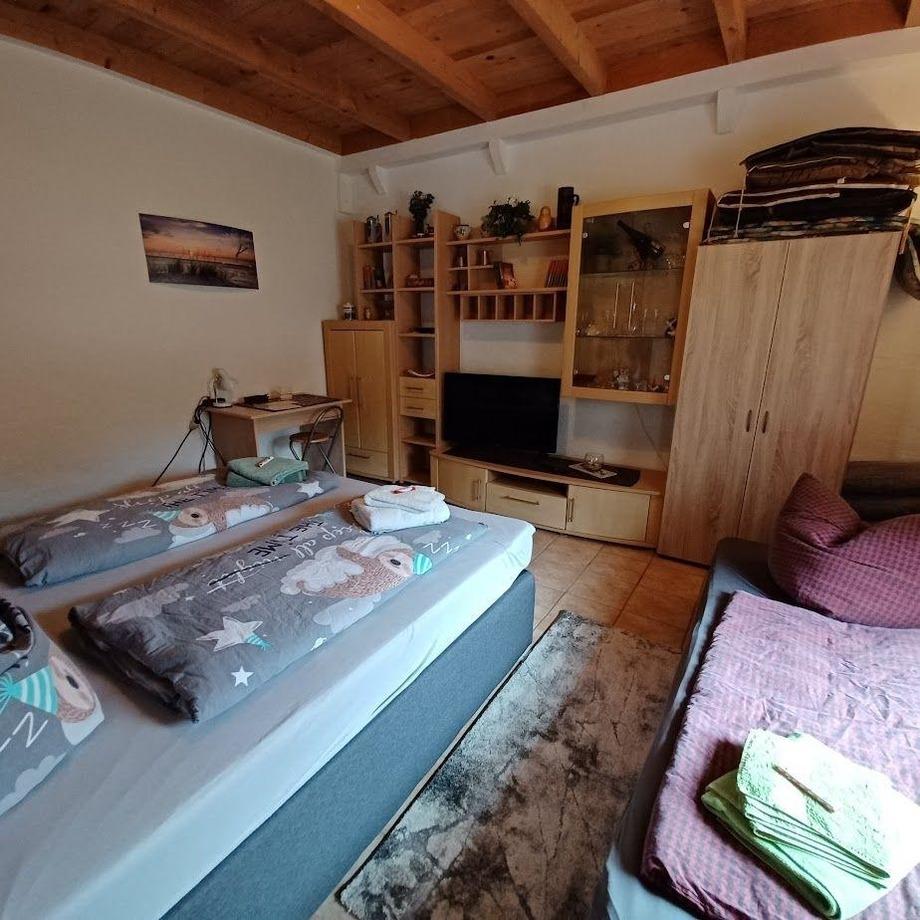 Ein Bad mit Dusche und WC sowie ein Wohnzimmer mit Kaminofen, TV, Netflix etc., Couch (geeignet als Schlafmöglichkeit für zwei Personen) sowie Zugang zur Terasse und Garten.