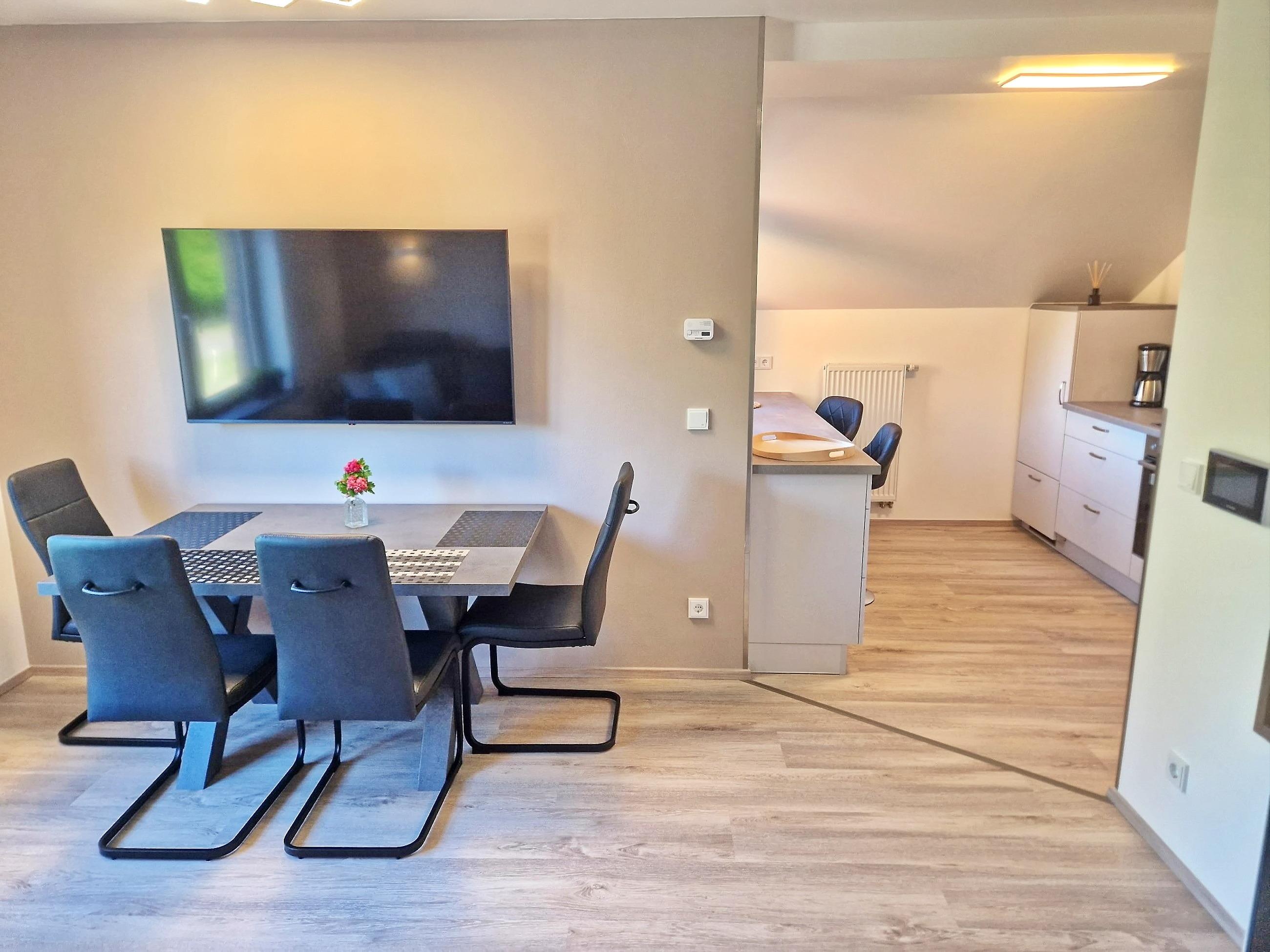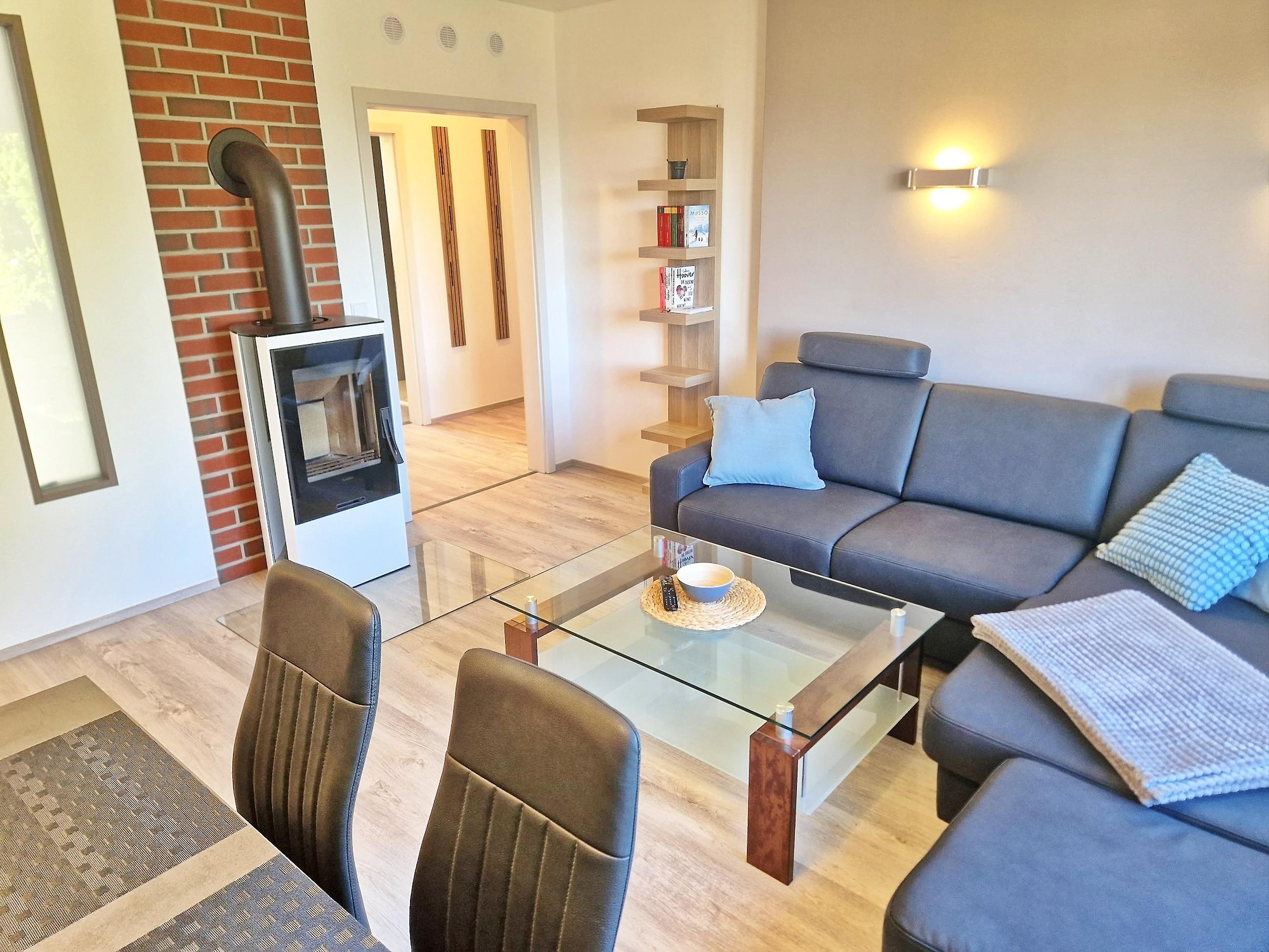 Sofa, großer Flat-TV, Essbereich für 4 Personen, Kamin (Erstausstattung zum Anfeuern inklusive), Sitzbar für 2 Personen