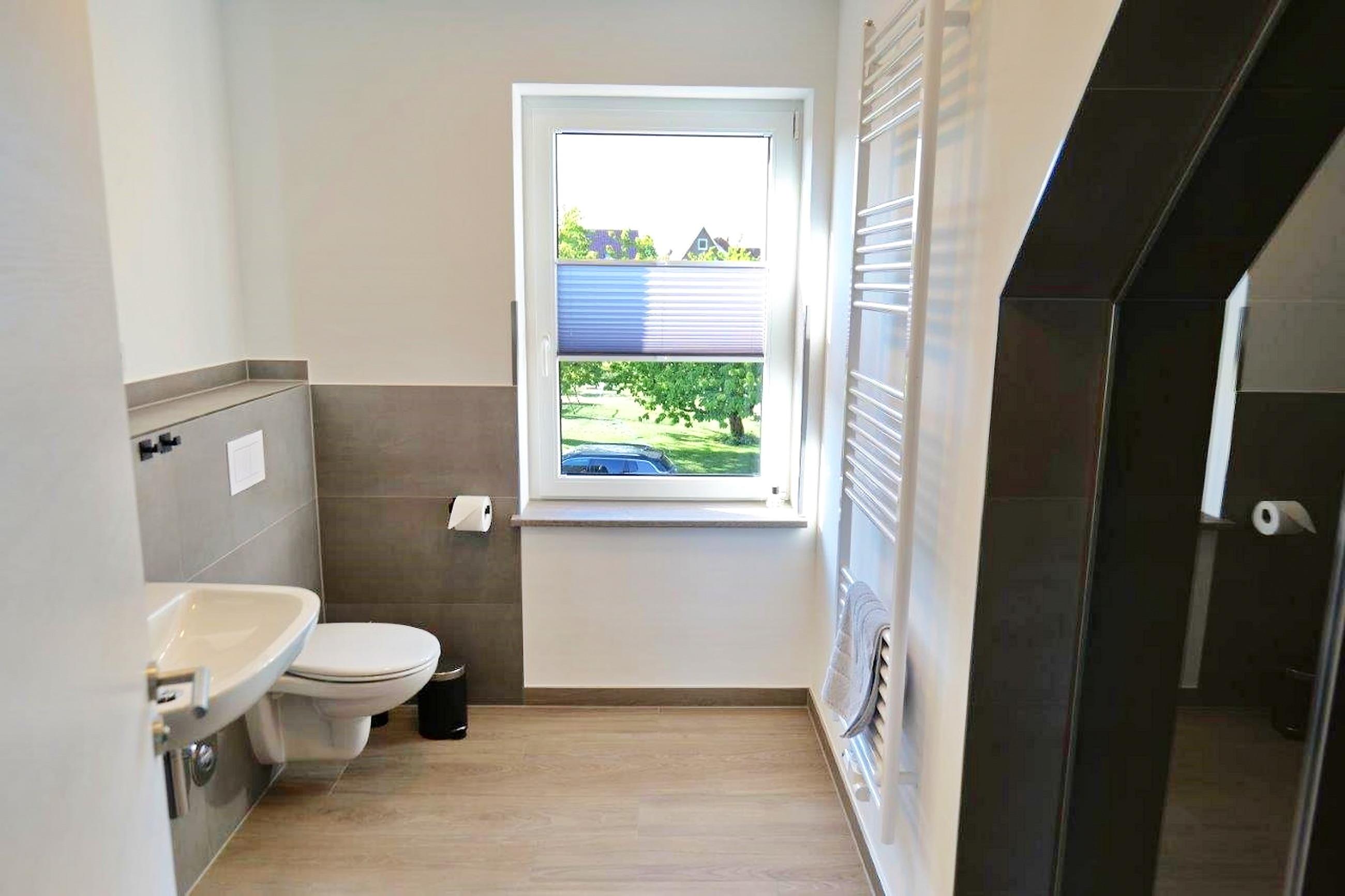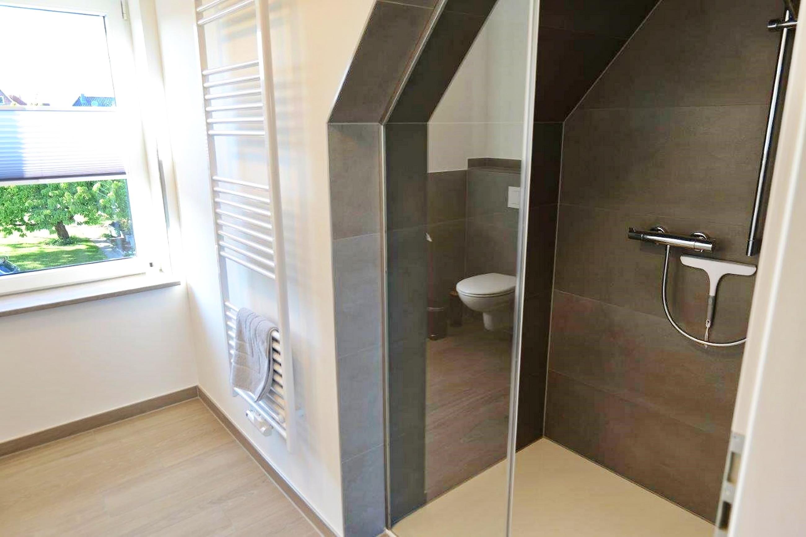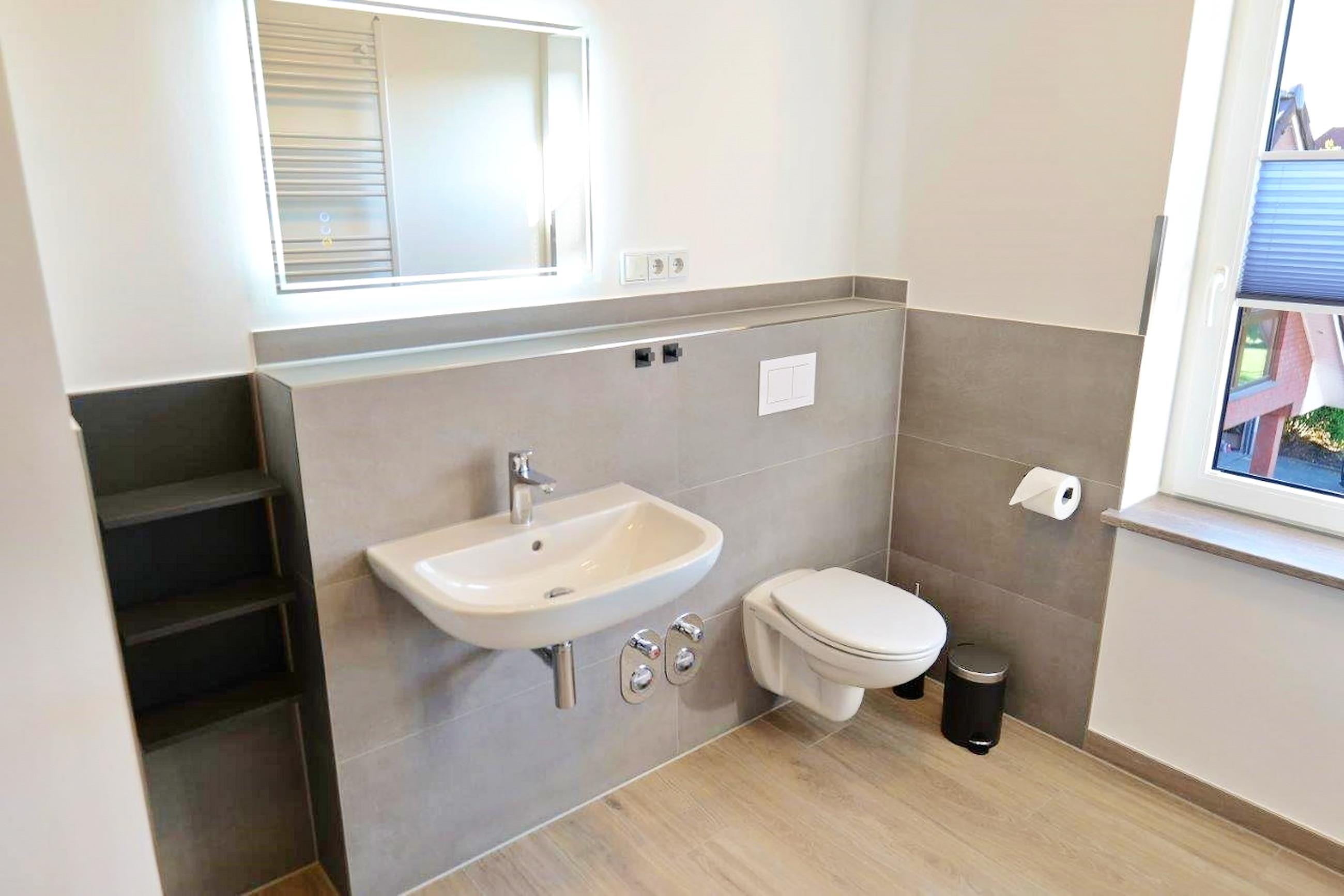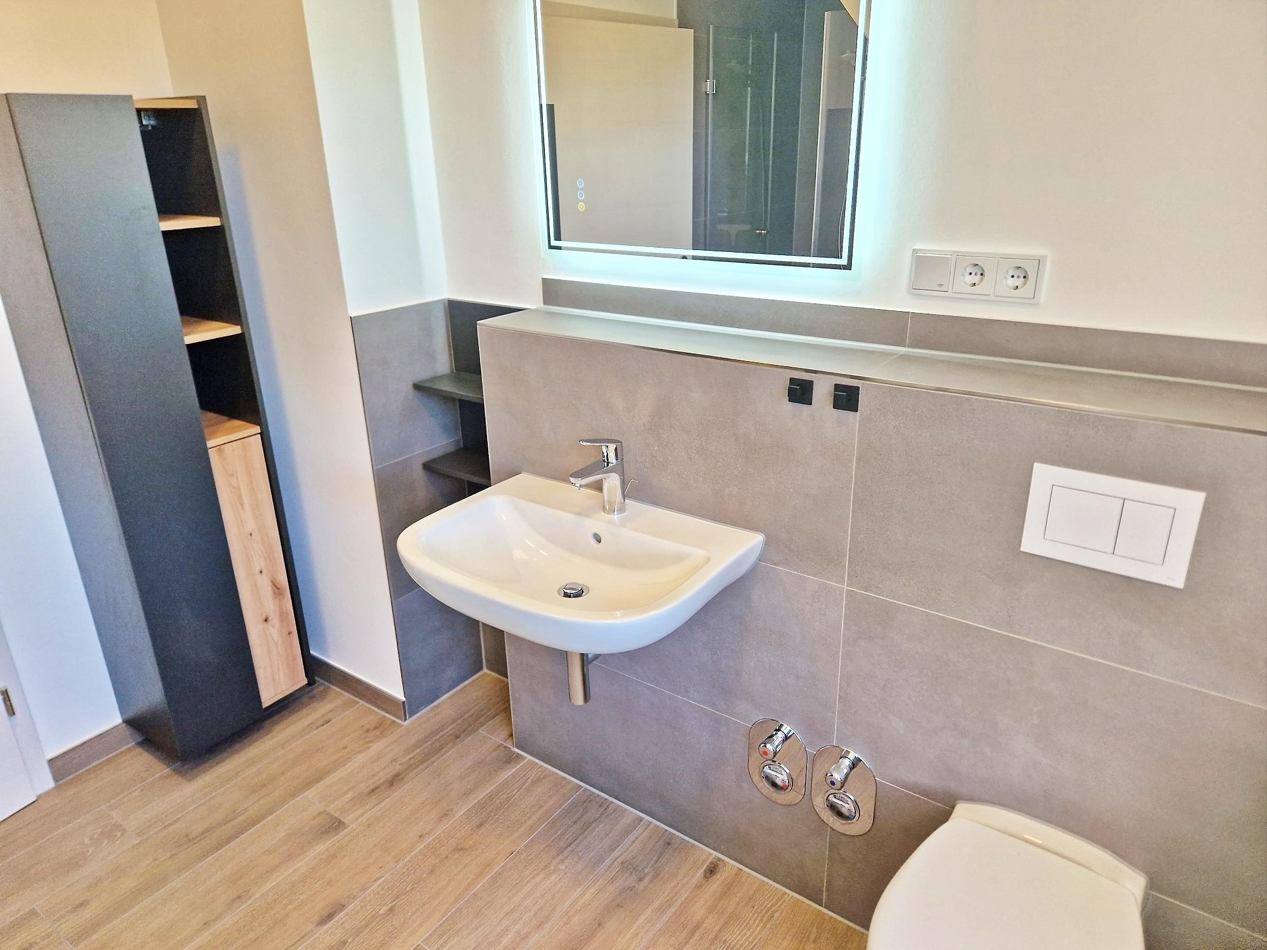 - Badezimmer mit Dusche/WC, Badschrank, beleuchteter Spiegel