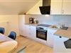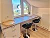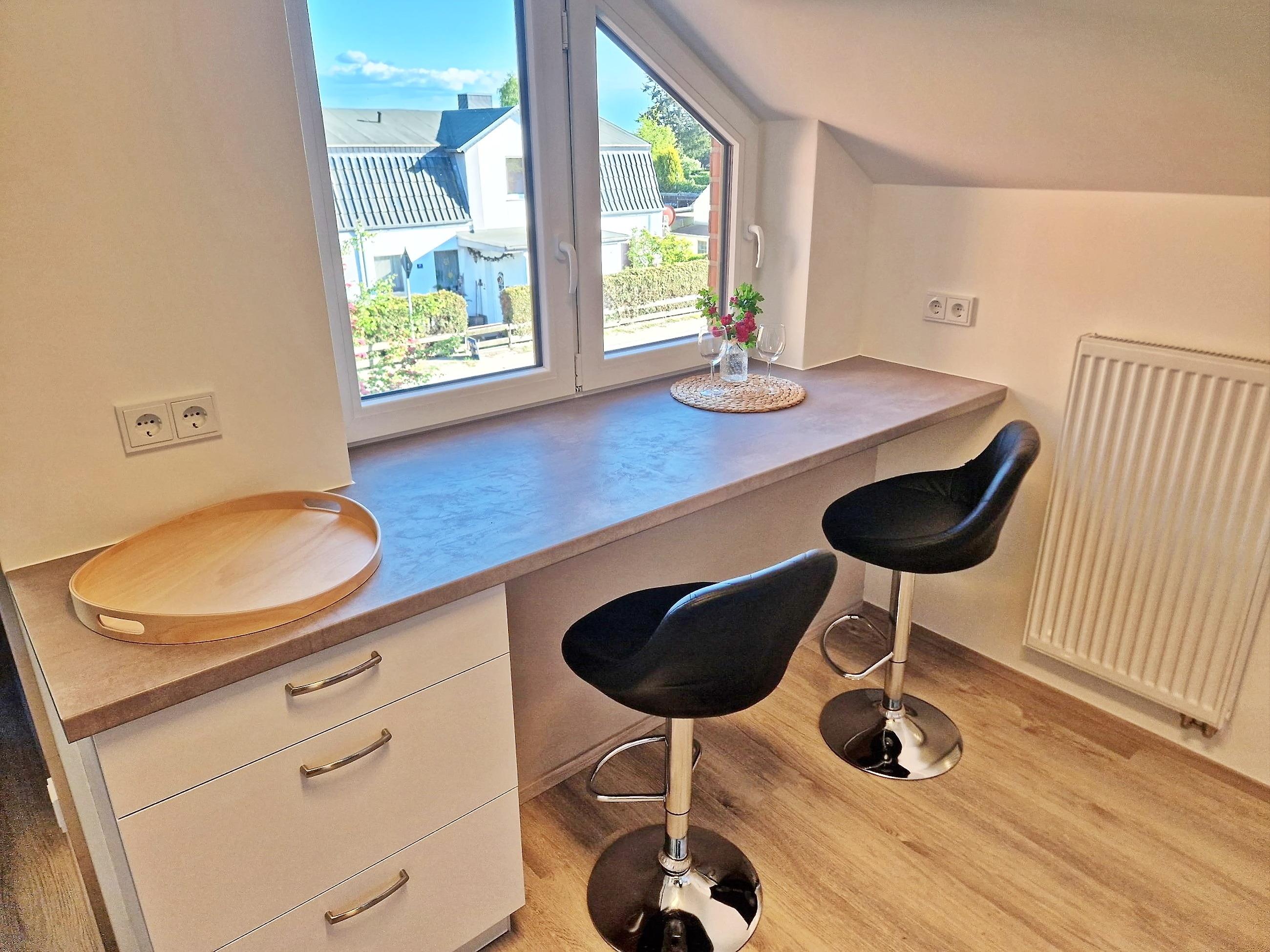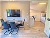 - Wohnzimmer mit offener Küche vollausgestattet, Essbereich für 4 Personen, Blick auf den Schweriner See
