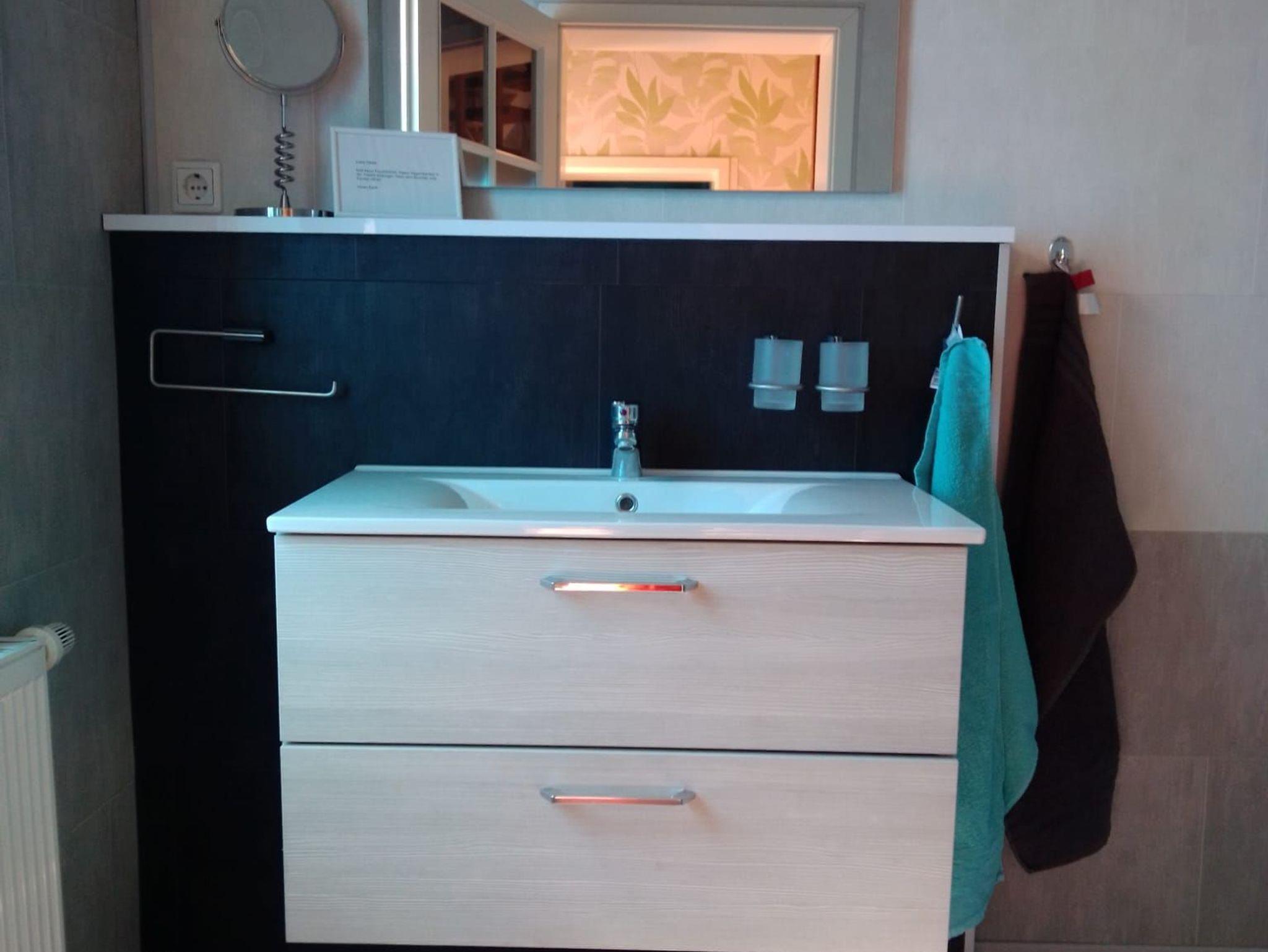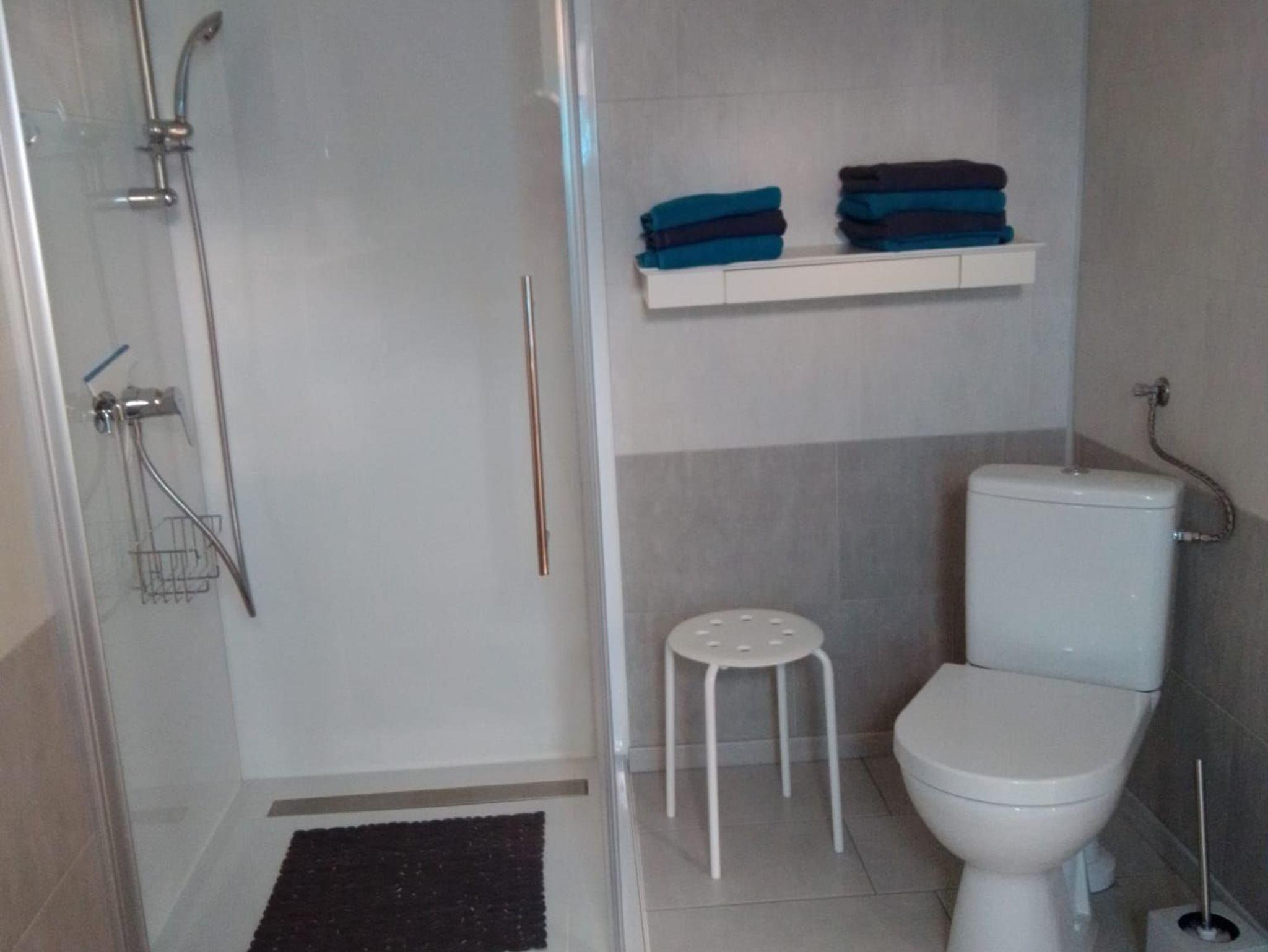 Das Badezimmer ist modern und mit einer ebenerdigen Dusche und WC ausgestattet.
