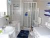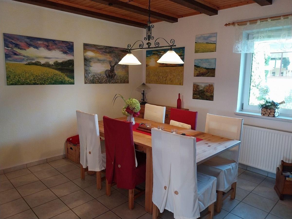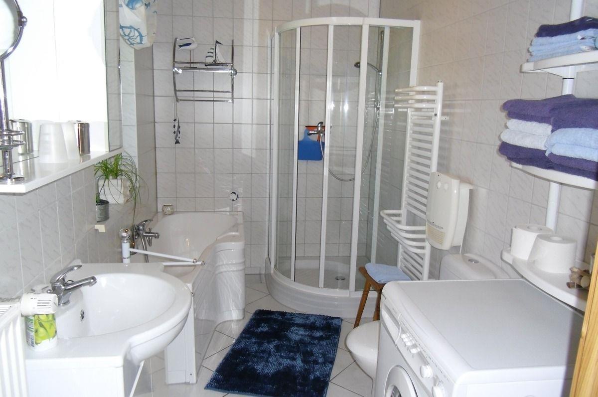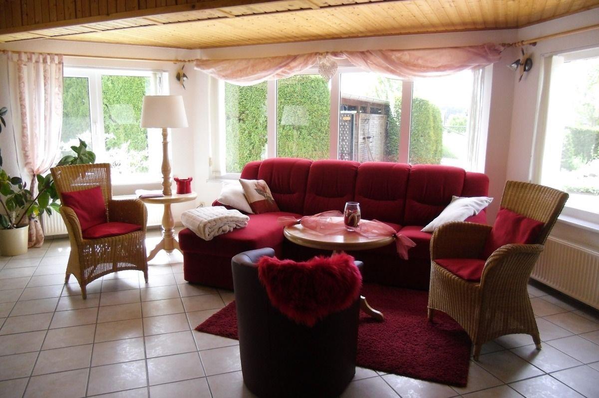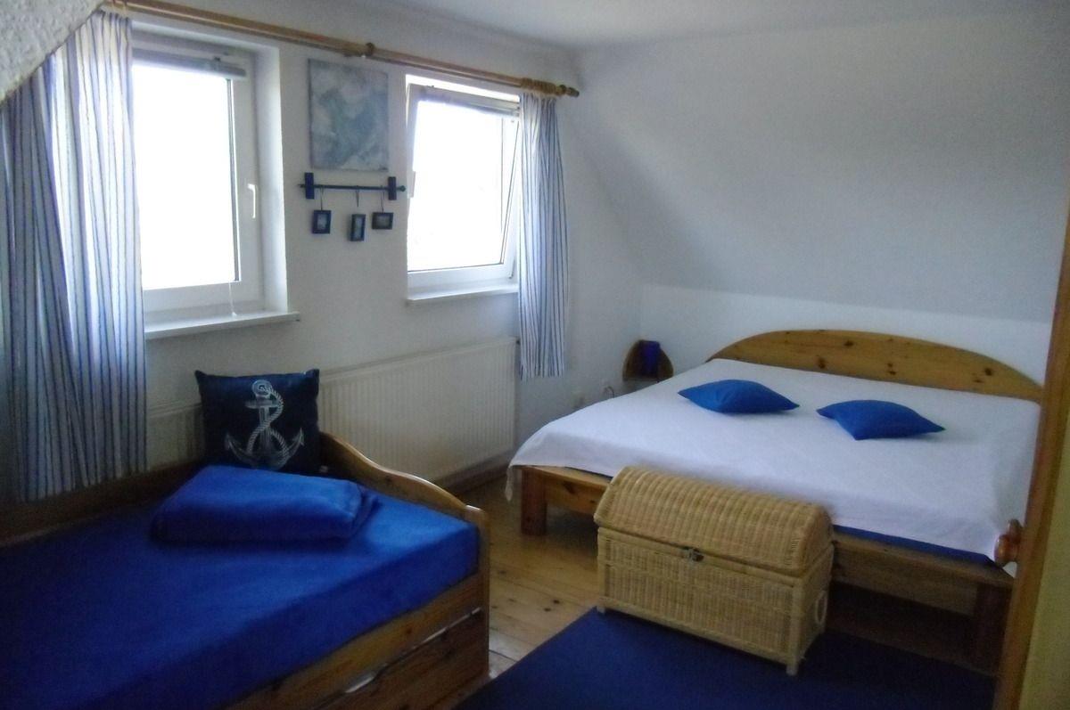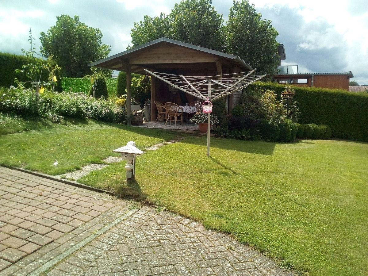 Sie betreten ihr Ferienhaus über einen kleinen Flur mit einer Bank, Garderobe, Spiegel und Schuhschrank. Das Wohnzimmer, mit Essbereich und offener Küche, ist mit einer Eckcouch, einem kleinen Tisch, einem Sessel, einem Wohnzimmerschrank, TV Gerät mit DVD ? Player und CD-Radio, sowie einem Esstisch mit 6 Stühlen möbliert. Die Einbauküche ist mit Geschirrspüler, Herd mit Backofen, Mikrowelle, Kühlschrank mit Gefrierfach, Kaffeemaschine, Wasserkocher, Brotmaschine und Toaster ausgestattet. Abgegrenzt zum Wohnbereich wird die Küche durch eine Tresenbar mit 3 Barstühlen. Vom Essbereich aus gelangen Sie in das Bad mit Dusche, Badewanne, WC und Waschmaschine. Über eine Treppe kommen Sie nach oben zu den zwei Schlafzimmern und dem Gäste WC. Hier ist auch ein großer Balkon. In den beiden Schlafzimmern stehen jeweils ein Doppelbett, ein Kleiderschrank und ein Tisch mit einem Stuhl. In einem Schlafzimmer steht zusätzlich ein Babybett, im Anderen noch ein Kojenbett mit ausziehbarer Aufbettung. Von der Küche aus kommen Sie auf die Terrasse mit Gartenmöbeln und Holzkohlgrill. Auf ihrem Grundstück befinden sich auch eine Lagerfeuerstelle und eine große Liegewiese zum entspannen. Parkplätze und 1 Carportplatz sind direkt am Haus vorhanden.