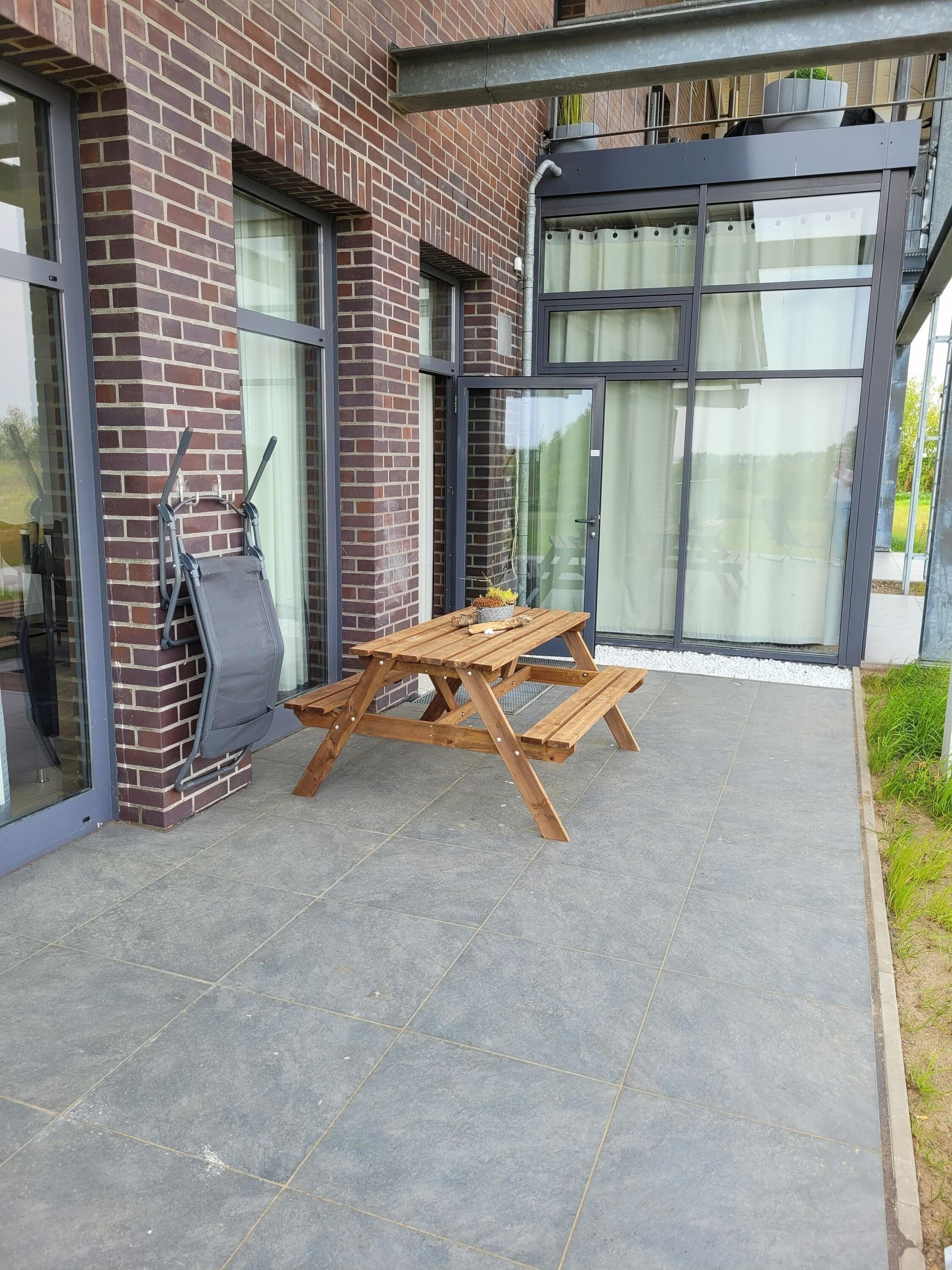 - große Terrasse mit zwei Sonnenliegen und Esstisch