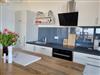 - offene moderne Küche mit hochwertiger Kücheninsel mit Barhockern, vollausgestattet, u.a. mit Geschirrspüler, 4-Platten-Induktionskochfeld, Backofen, Kühlschrank, Kaffeemaschine, Wasserkocher, Toaster, Geschirr, Besteck, Küchenutensilien u.v.m.