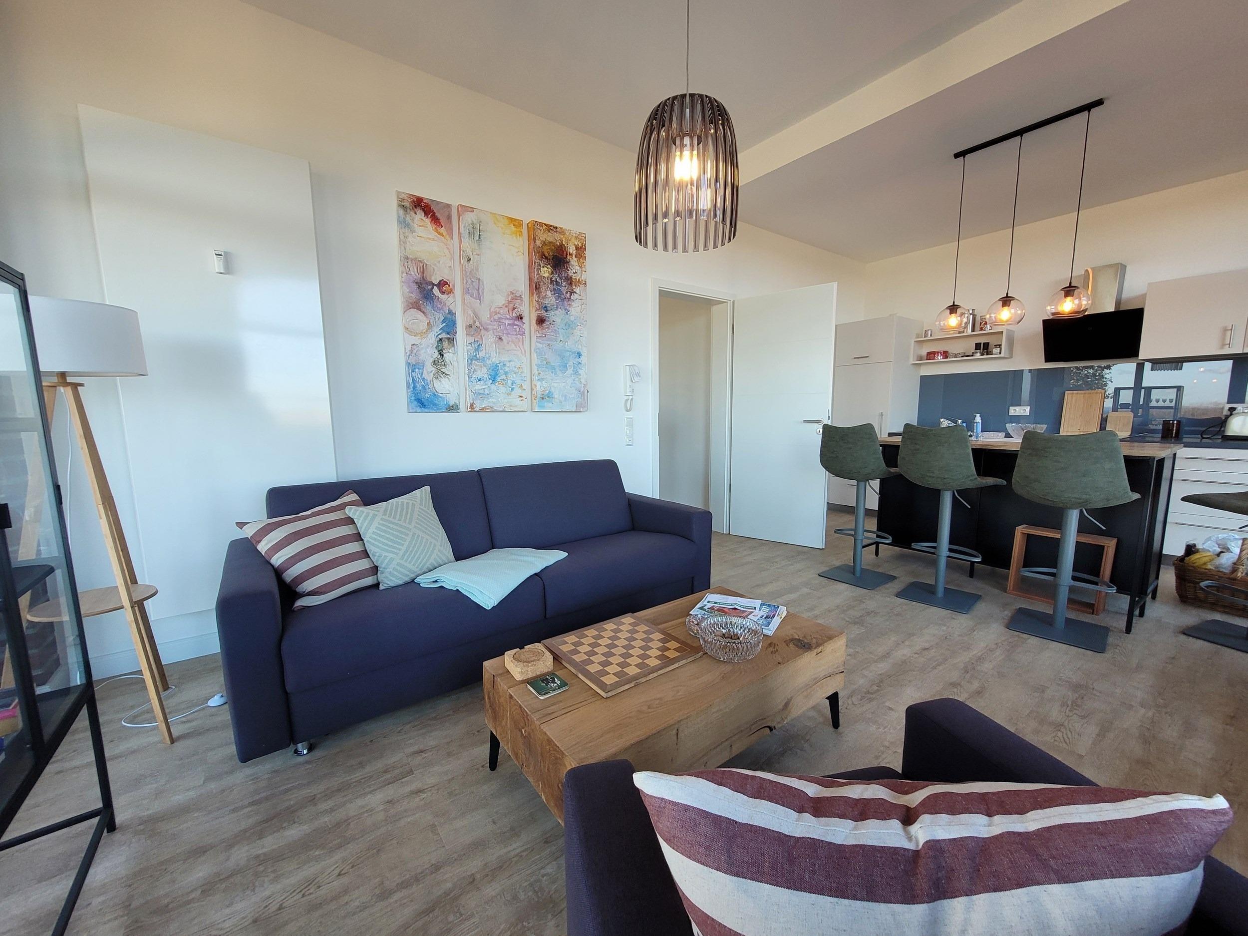 Die Wohnung empfängt Sie mit einem hellen und und modern eingerichteten Wohnbereich, in dem ein Komfortsofa, nach Umwandlung zum Schlafsofa, zwei zusätzliche Schlafgelegenheiten mit den Maßen 1,60m x 2,00m bietet. Der Selbstversorger findet eine in den Wohnbereich integrierte, sehr hochwertig ausgestattete Küche. Für gemeinsame Mahlzeiten nutzen Sie die große Ess-Kücheninsel mit 4 bequemen Barhockern oder bei gutem Wetter den Esstisch auf der etwa 18 qm großen Terrasse. Der zusätzliche Balkon mit wunderbarem Blick bietet Ihnen Entspannung- wahlweise in der Hängematte oder auf zwei Sonnenliegen.