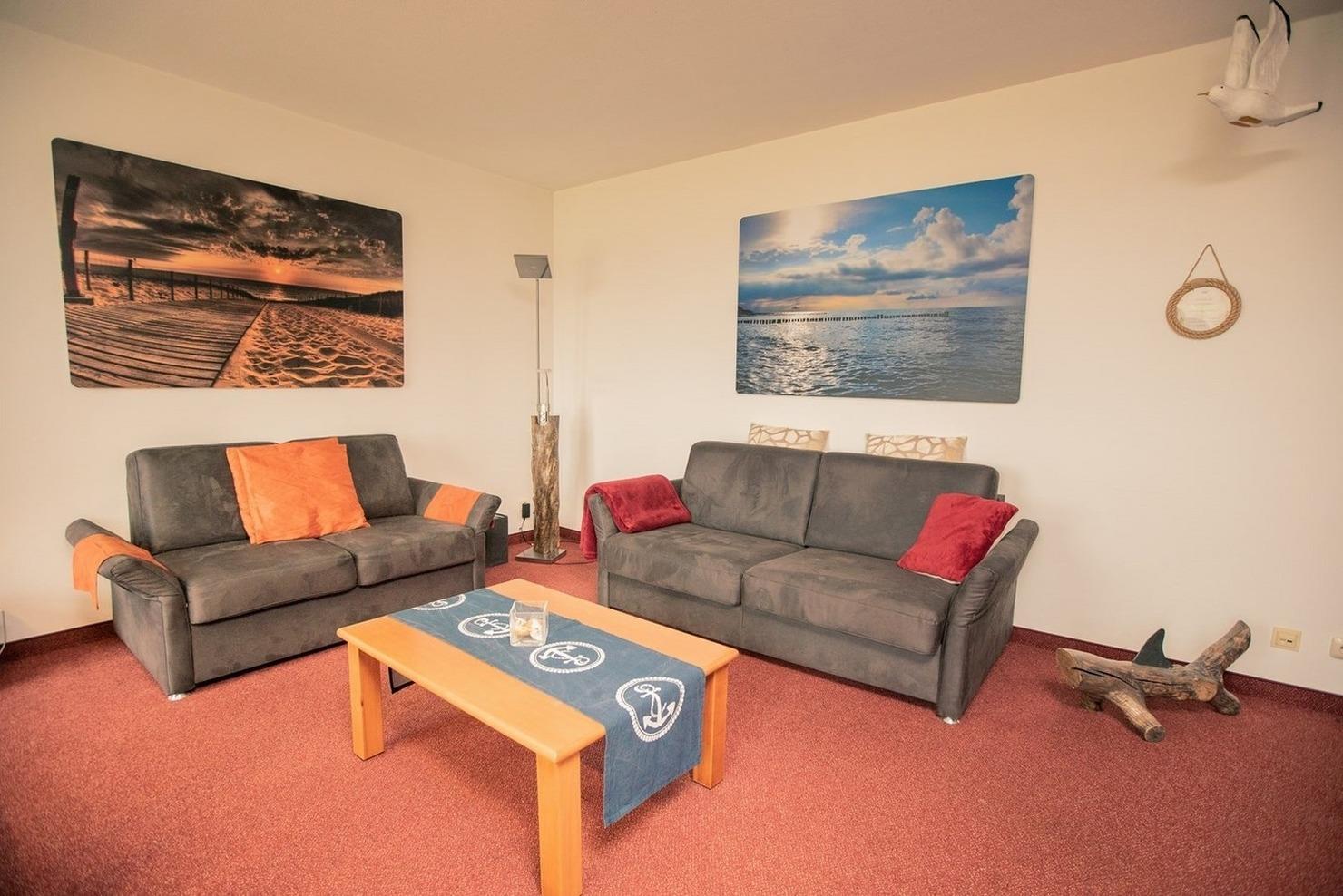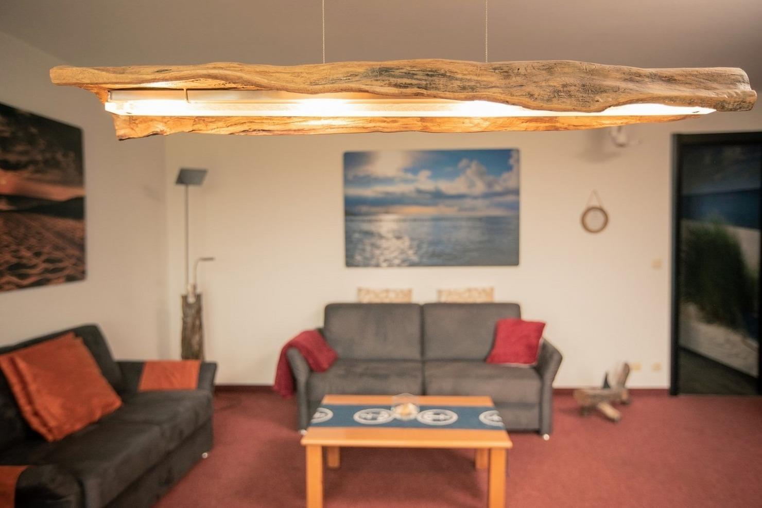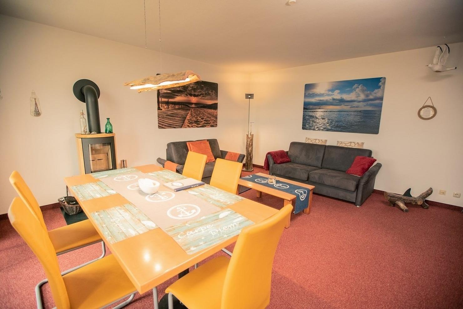 - Wohnzimmer mit Schlafcouch, Essbereich für 6 Personen, Wohnwand mit LED-TV + Musikanlage, Kamin