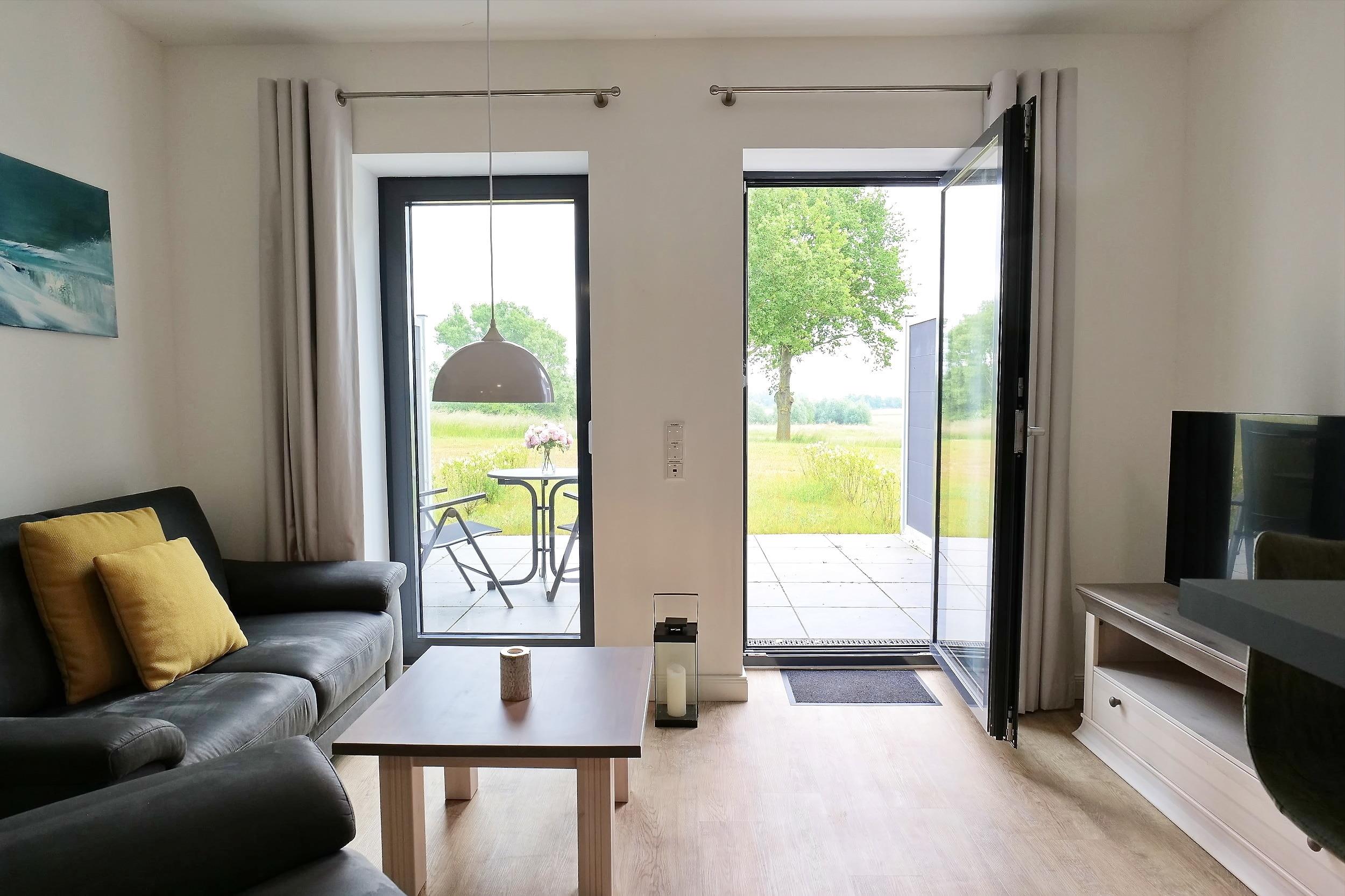 Die charmant möblierte Ferienwohnung Golfblick [&] Meer - No. 6 am Golfplatz besitzt eine saisonal möblierte Terrasse in Richtung Süd.-Ost, so dass Sie schon am Morgen die Sonne genießen können. Die geräumige Wohnfläche beträgt 50qm und bietet somit eine ideale Wohnungsgröße für den Urlaub zu zweit. Der einladend eingerichtete Wohn-/Essbereich empfängt Sie mit behaglicher Ausstattung. Moderne Unterhaltungselektronik sowie kostenfreie WLAN-Nutzung sind selbstverständlich auch vorhanden.