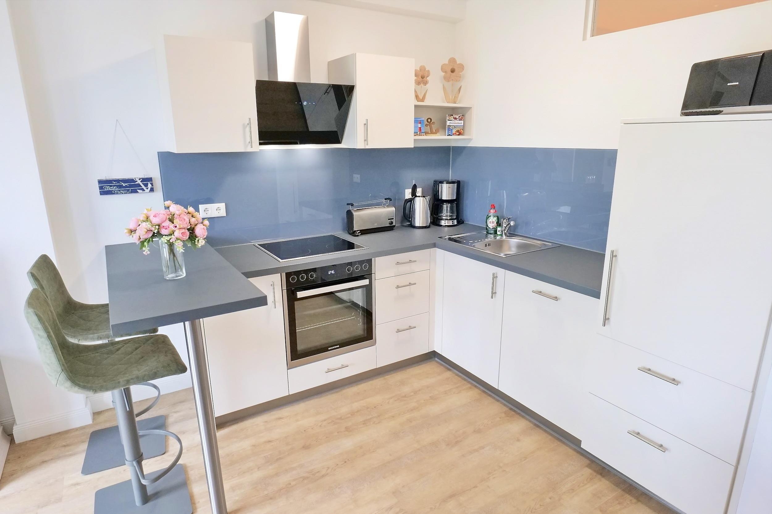 Eine in den Wohnraum integrierte, voll ausgestattete Küche ermöglicht Ihnen bei Bedarf die Selbstversorgung, wodurch Sie Ihren Aufenthalt völlig unabhängig gestalten können. Erholsam nächtigen Sie in dem separaten Schlafzimmer mit behaglichem Doppelbett. Diese Wohneinheit besitzt ein geräumiges Duschbad mit Waschtisch, WC und Handtuchheizung. Haustiere sind in der Nichtraucherwohnung nicht erlaubt. Für mitgebrachte Fahrräder stehen Fahrradboxen nach Verfügbarkeit bereit. Ihren PKW parken Sie kostenfrei auf einem reservierten Außenstellplatz. E-Ladesäulen in 100 Meter Entfernung.