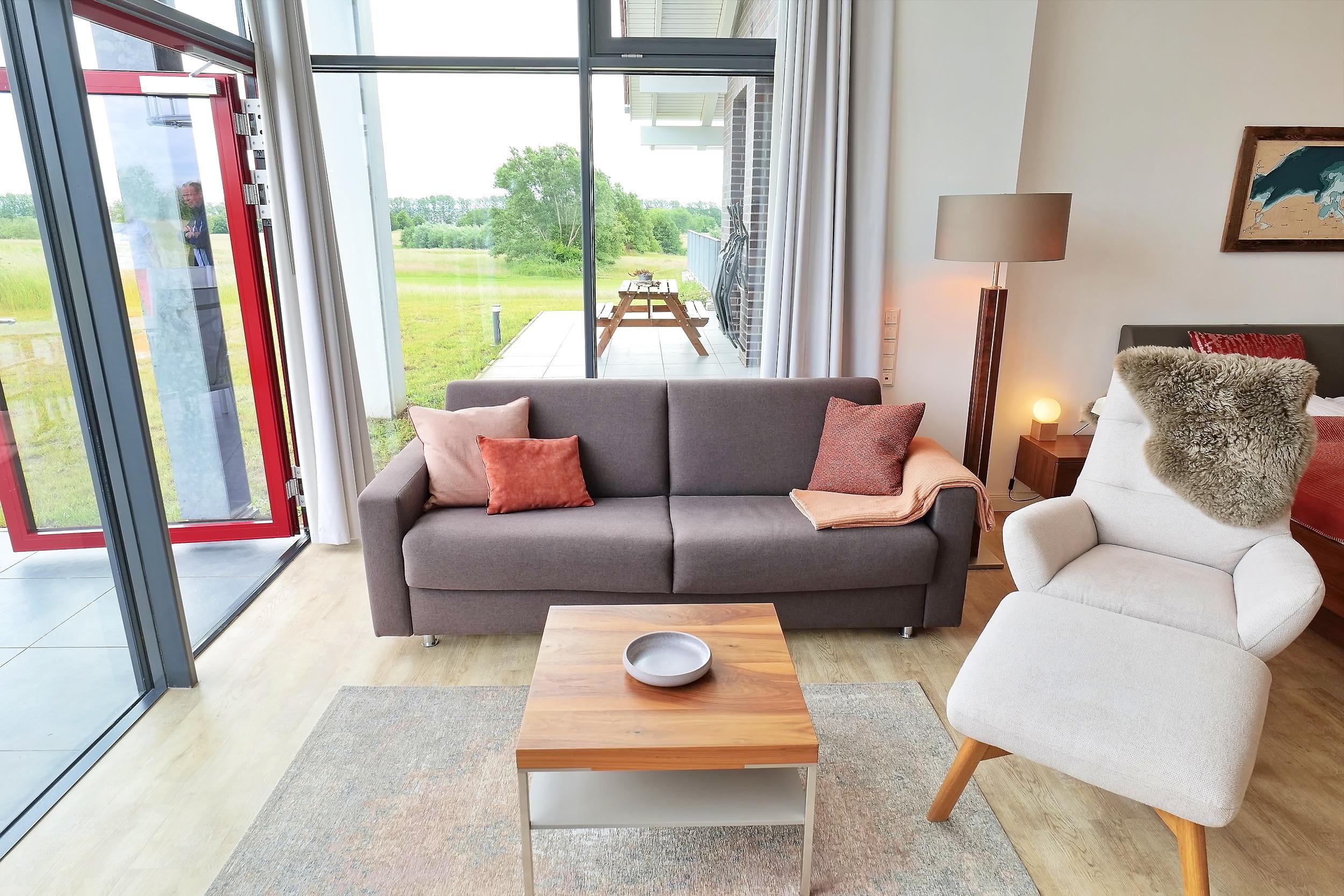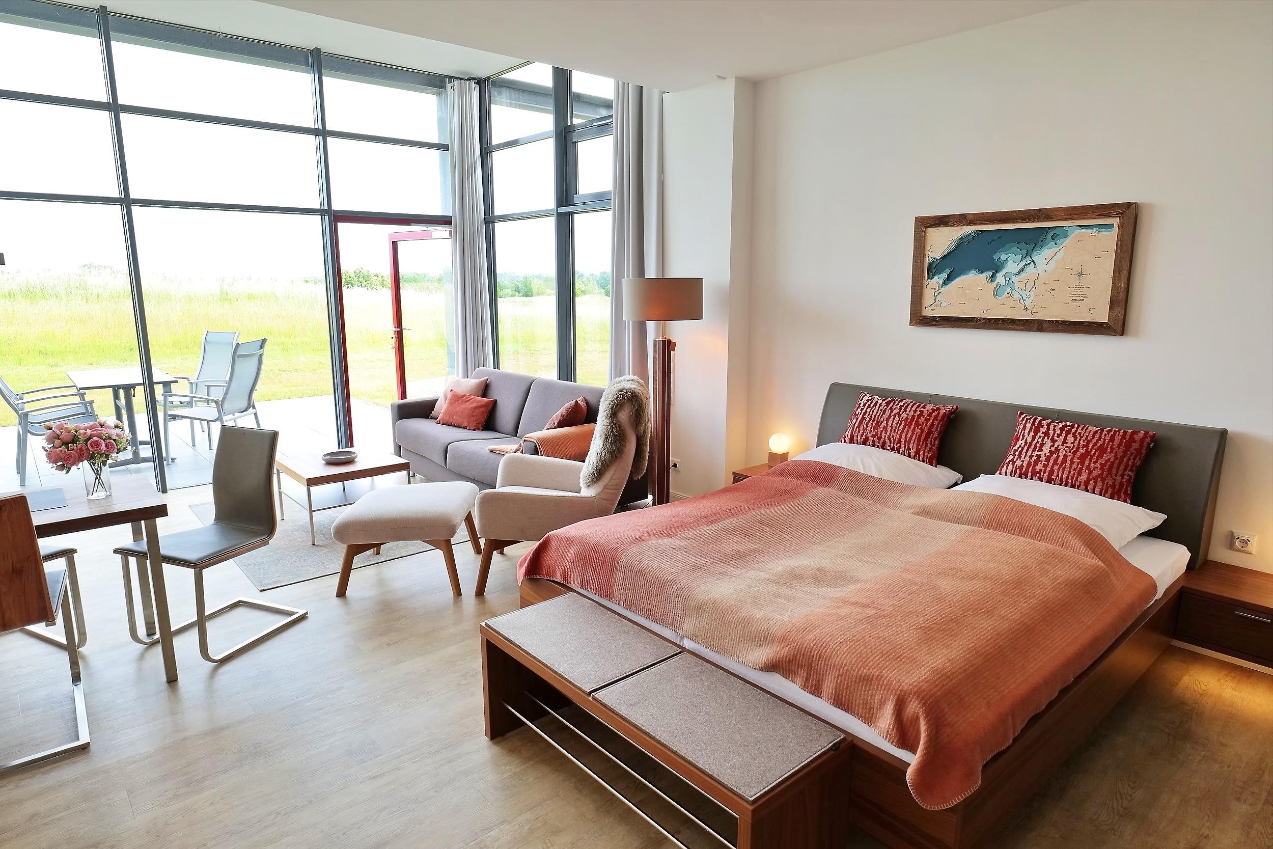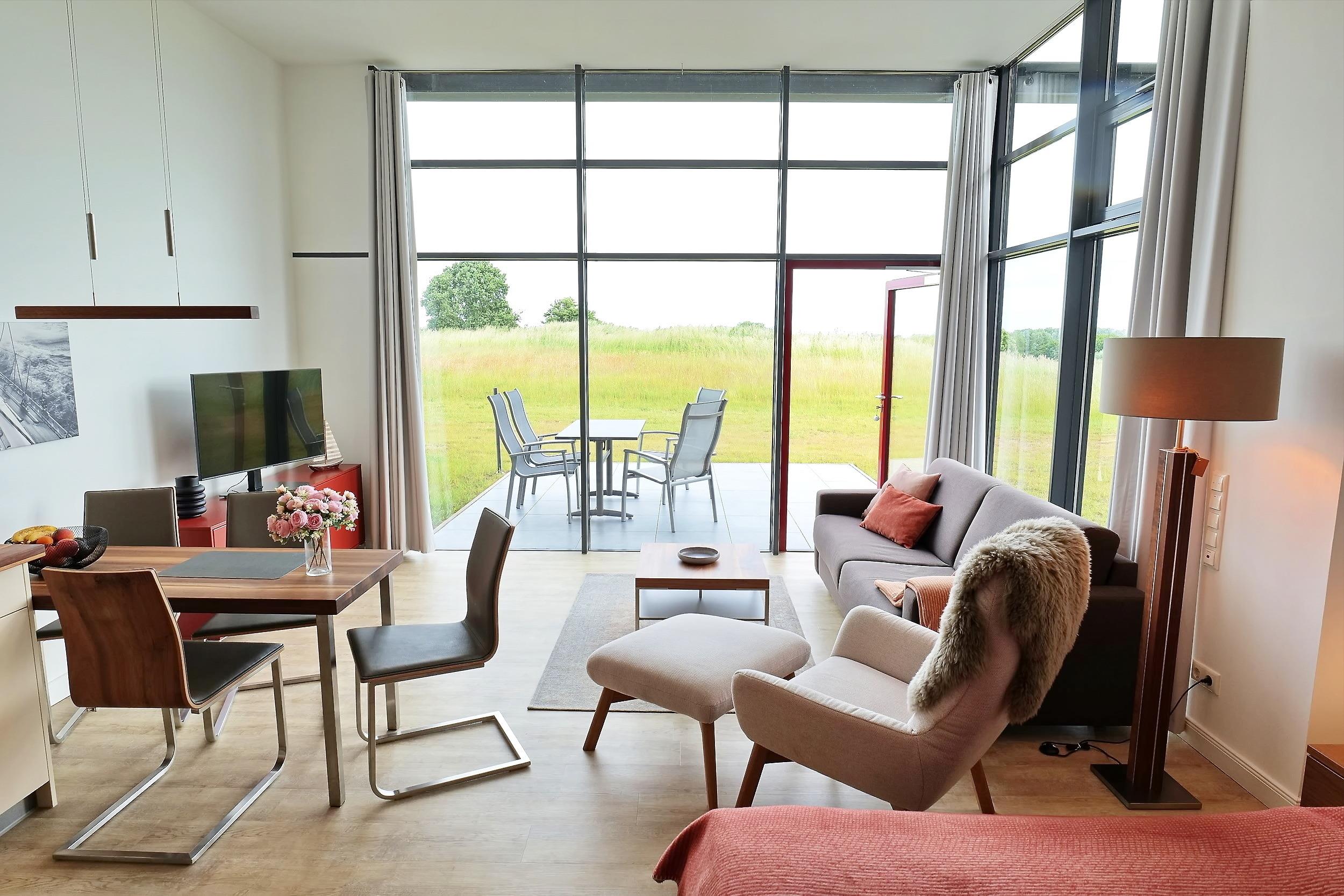 Die 1- Zimmer Komfort Ferienwohnung Huk's No. 20 - Aurora Vista, bietet eine großzügige Wohnfläche von 52qm und verwöhnt mit einer saisonal möblierten Terrasse in nördliche Ausrichtung. Das stilvoll möblierte Appartement befindet sich im Obergeschoss des Hauses und kann mit bis zu 4 Personen belegt werden. Im hochwertig möblierten Wohn-/Essbereich empfängt Sie ein Sofa, welches eine Schlaffunktion besitzt und daher bequem in ein Schlafsofa mit zwei zusätzlichen Schlafmöglichkeiten umgewandelt werden kann. Zudem befinden sich ein Fernsehgerät sowie kostenfreie WLAN-Nutzung im Appartement.