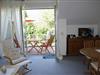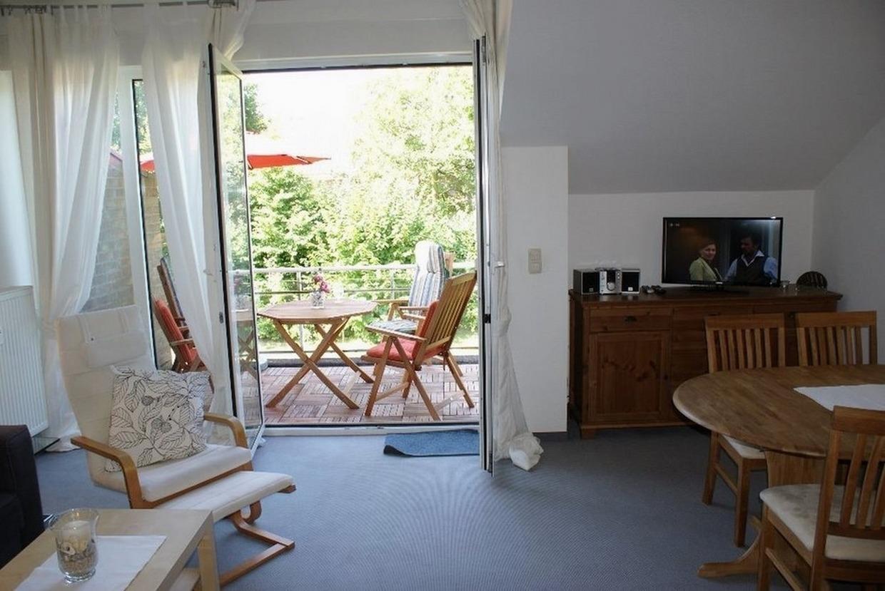 Wohnzimmer mit ausziehbarer Doppelcouch, Liegestuhl, Essbereich mit 4 Stühlen, TV, Radio und Zugang zum Balkon