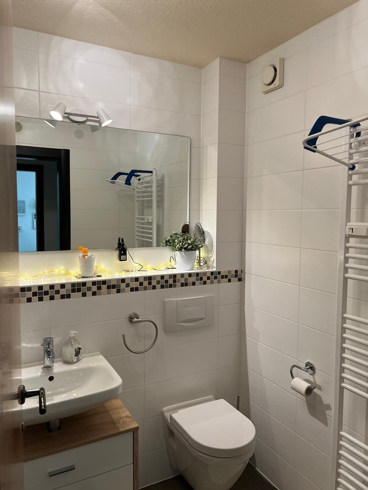 Badezimmer mit Dusche, WC, Spiegelschrank