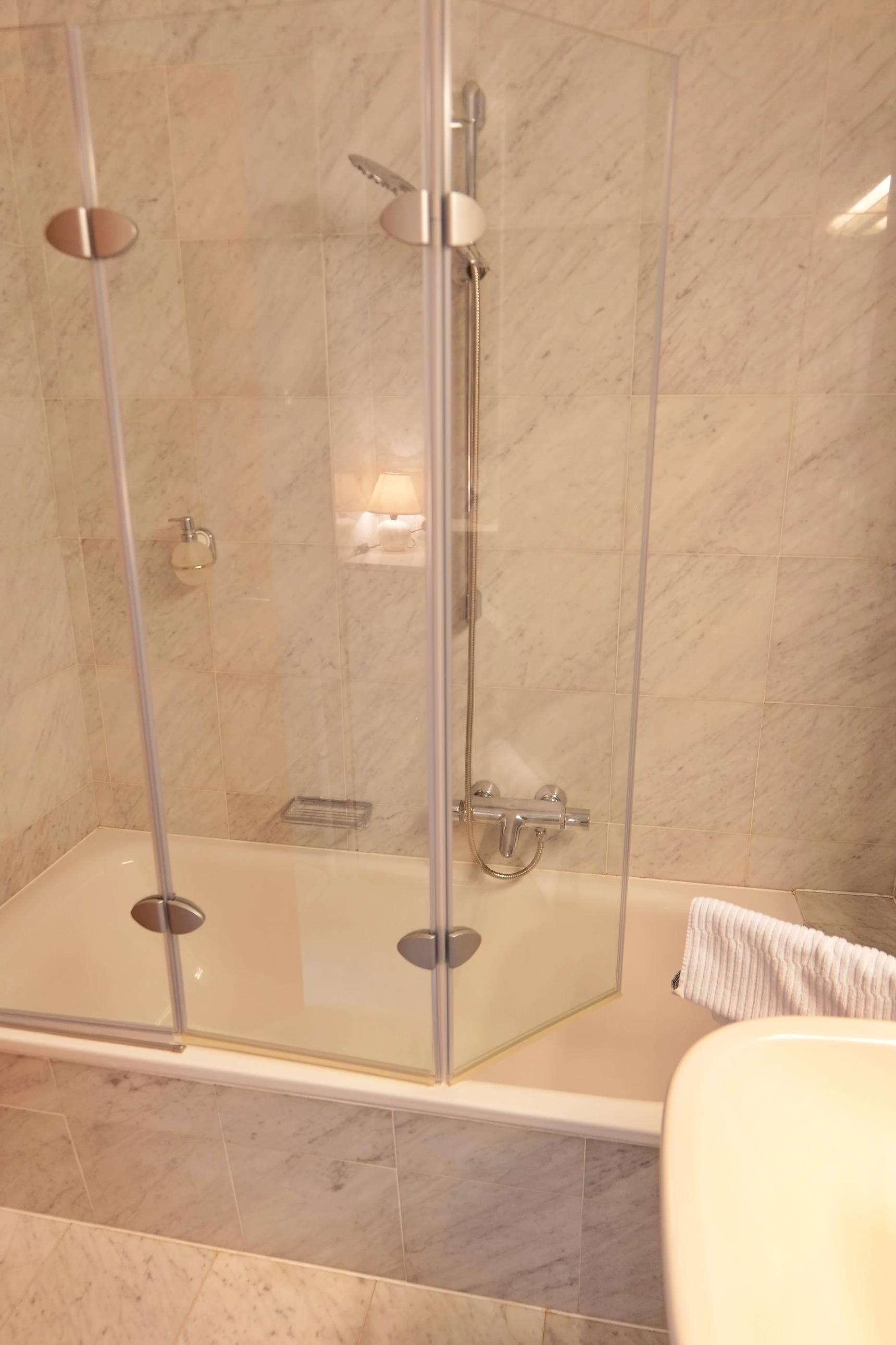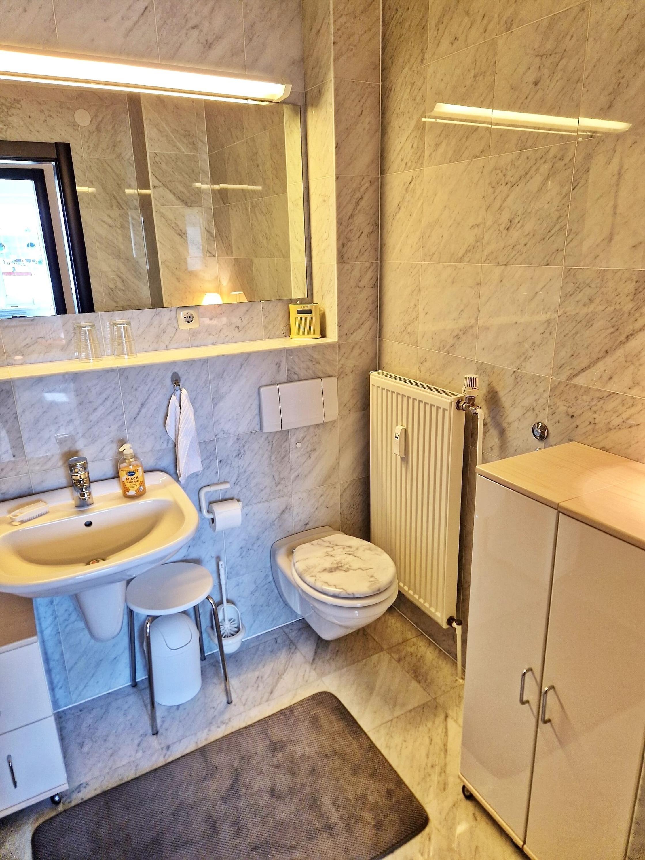 Badezimmer mit Badewanne, WC, Spiegelschrank