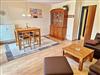 Wohnzimmer mit Couch (ausziehbar), Essbereich mit 4 Stühlen, TV und Zugang zur Terrasse