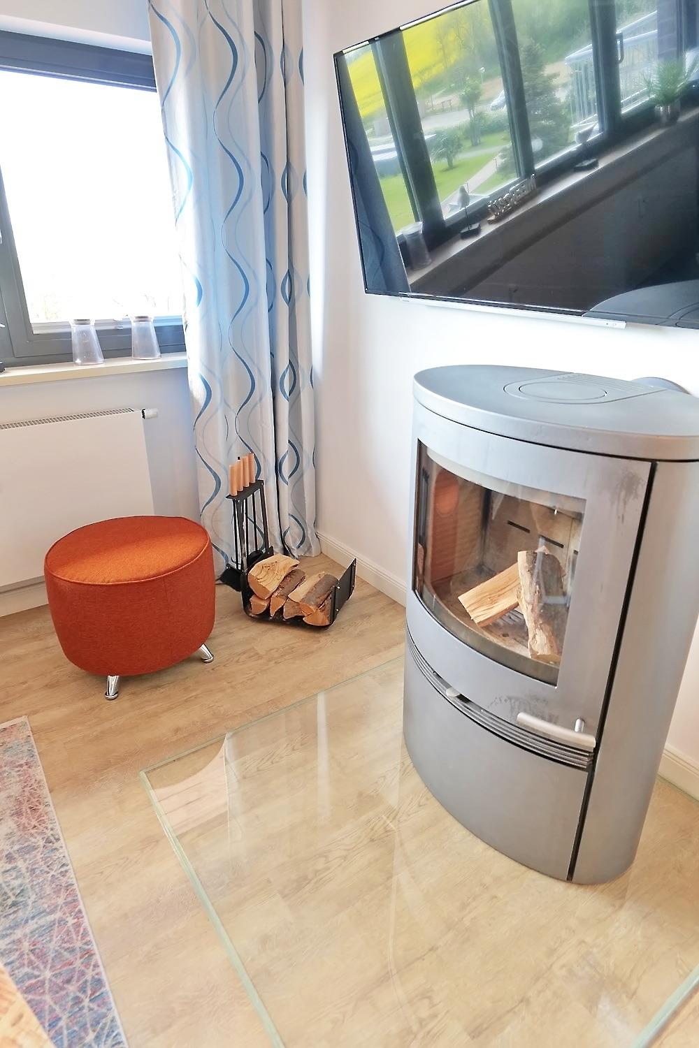 - großes Wohnzimmer mit offener Küche und Essbereich, ua. mit Couch (ausziehbar zur Schlafcouch mit Lattenrost), Flat-TV, Kamin, Wohnzimmertisch, Highboard, Internetradio