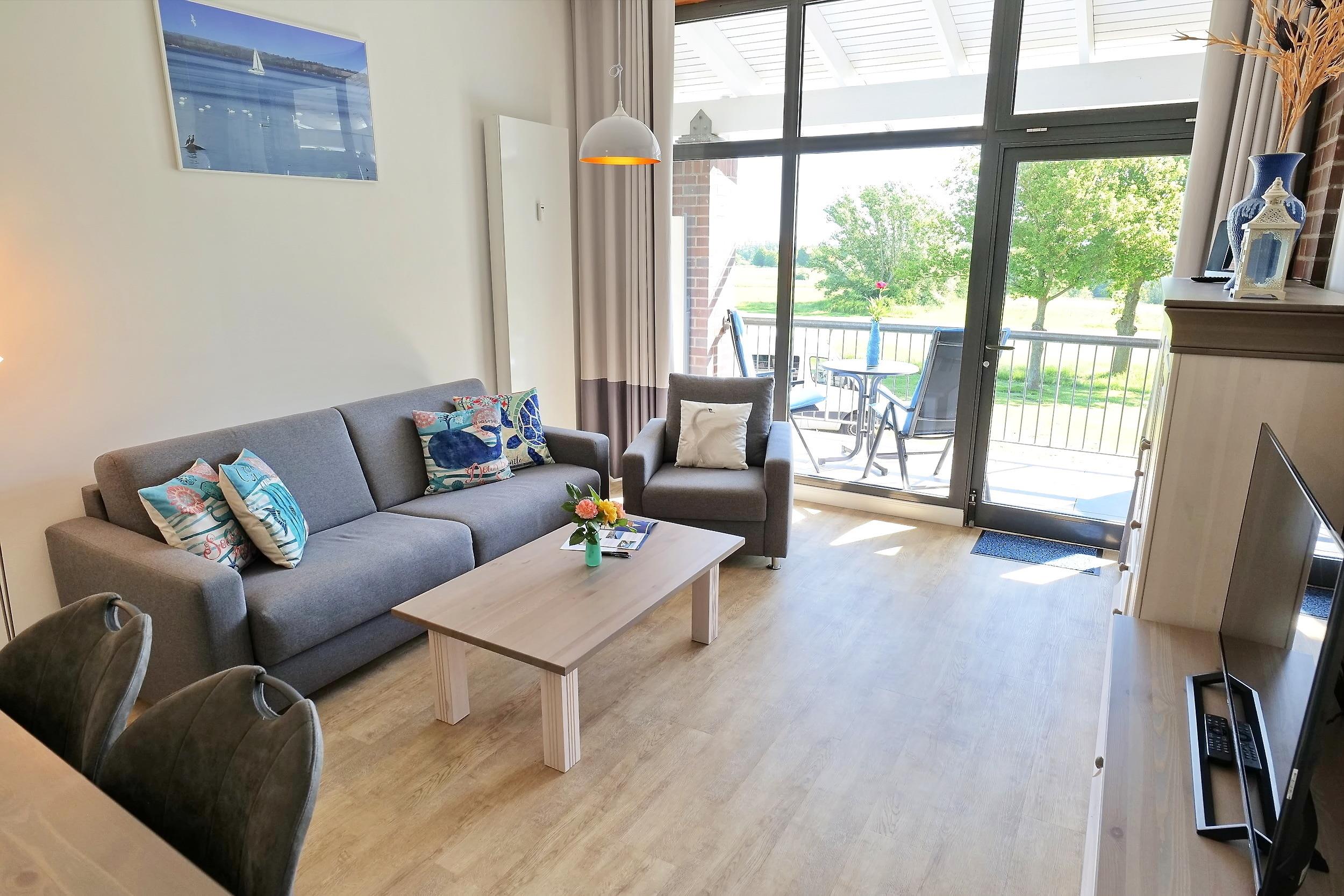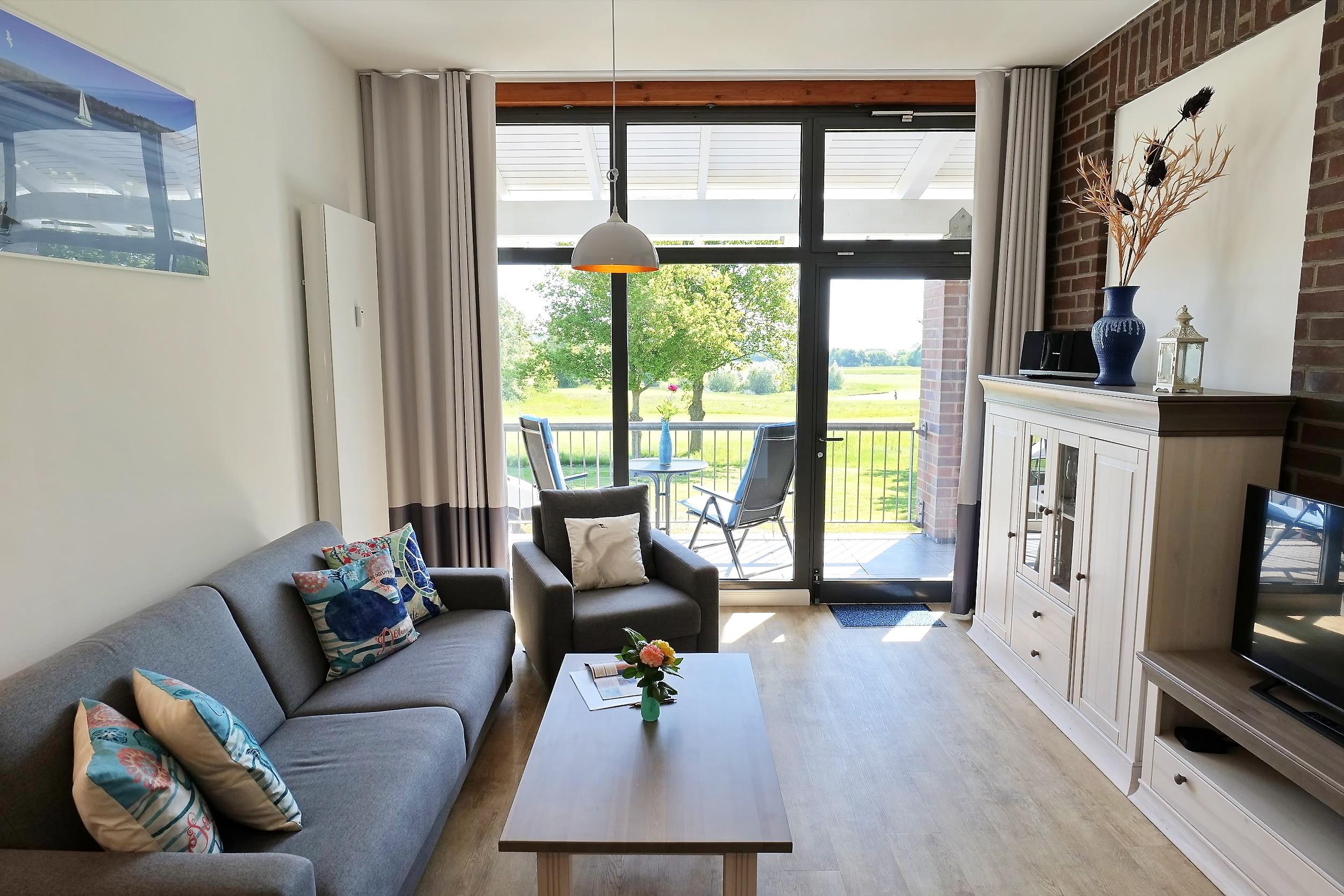 Es empfängt Sie ein gehoben ausgestattetes, zudem sehr geräumiges 2-Zimmer-Ferienappartement mit saisonal möbliertem Balkon. Der großzügige überdachte Balkon bietet einen schönen Blick auf den Golfplatz und weiter aufs Meer und die Marina. Eine komplett ausgestattete Küche lässt für Selbstversorger kaum Wünsche offen. Ein Schreibtisch mit einem bequemen Stuhl sowie ein Internetanschluss per WLAN erlauben auch die Ausführung beruflicher Aktivitäten. Die neu eingerichtete Wohneinheit mit einer offenen Küche, einem separaten Schlafzimmer, einem hellen Wohnzimmer, einem modernen Badezimmer sowie einem geräumigen Entree und einem Abstellraum, wo ein Lüfter, das Kinderbett und Kinderstühle geparkt sind, kann mit bis zu 4 Personen und einem Kind bis ca. 6 Jahren bewohnt werden. Mit dem Fahrstuhl gelangen Sie bequem zu Ihrer Ferienwohnung im Obergeschoss des Hauses.