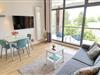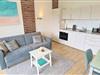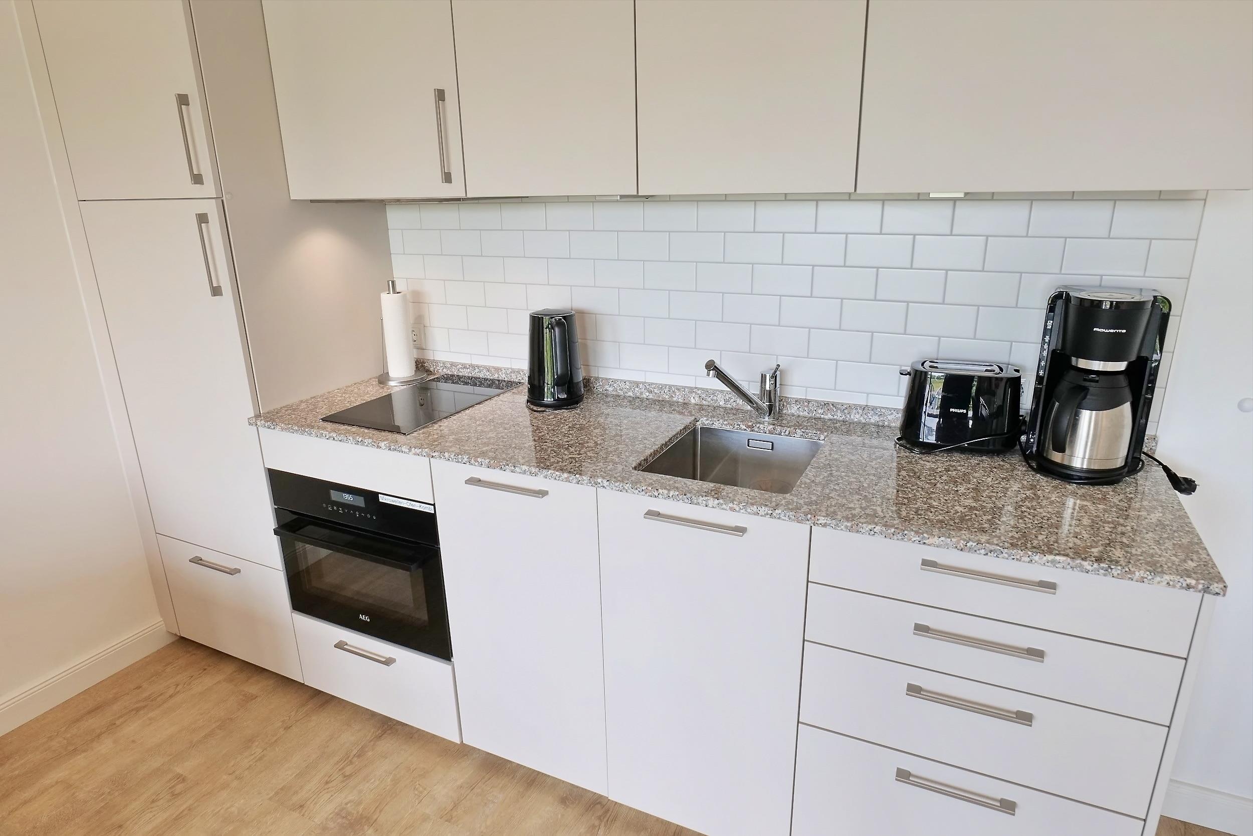 - Wohnzimmer mit Esstisch, Fernseher, vollständiger Küchenzeile mit Geschirrspülmaschine, kombiniertem Backofen/ Mikrowelle und einem komfortablen ausziehbaren Schlafsofa (2,0 x 1,6 m)