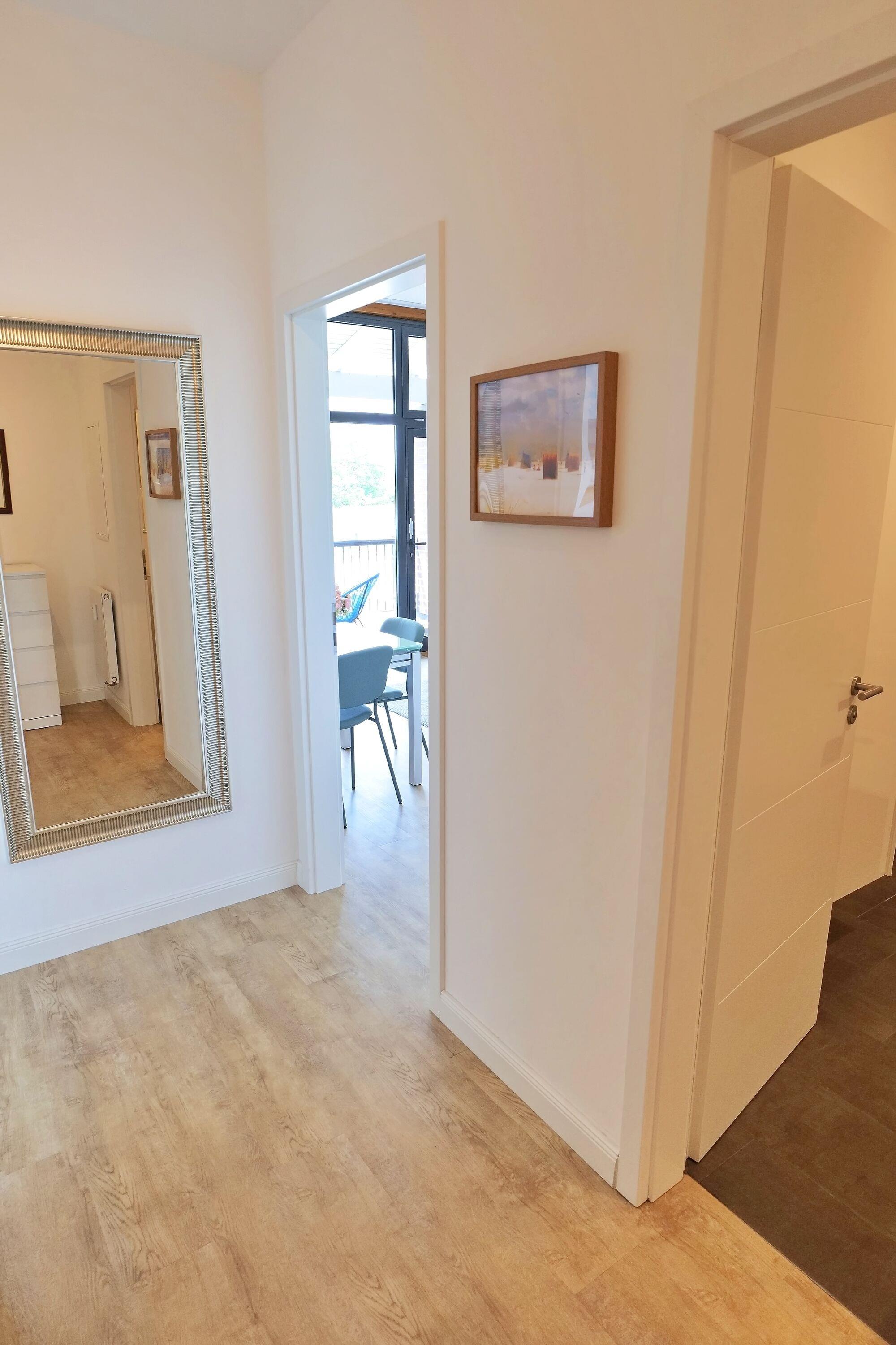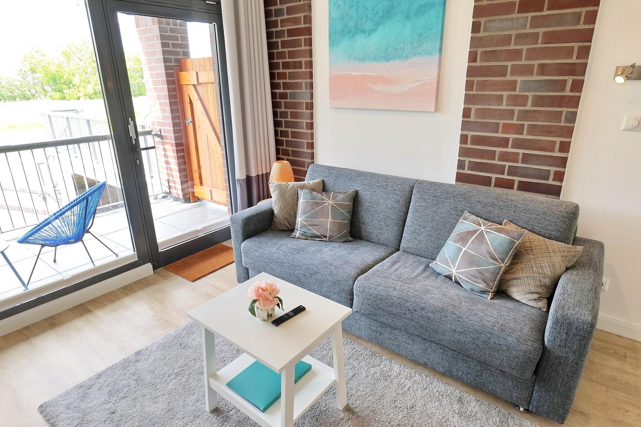 Das Appartement ist modern und individuell eingerichtet. Ein kombinierter Wohn- und Essbereich mit einer integrierten und voll ausgestatteter Küchenzeile, ein Bad, sowie ein separates Schlafzimmer bieten Platz für bis zu 4 Personen. Der Westbalkon in der 1. Etage des Gebäudes lädt am Abend zu einem Glas kühlen Weißwein in der untergehenden Sonne ein.