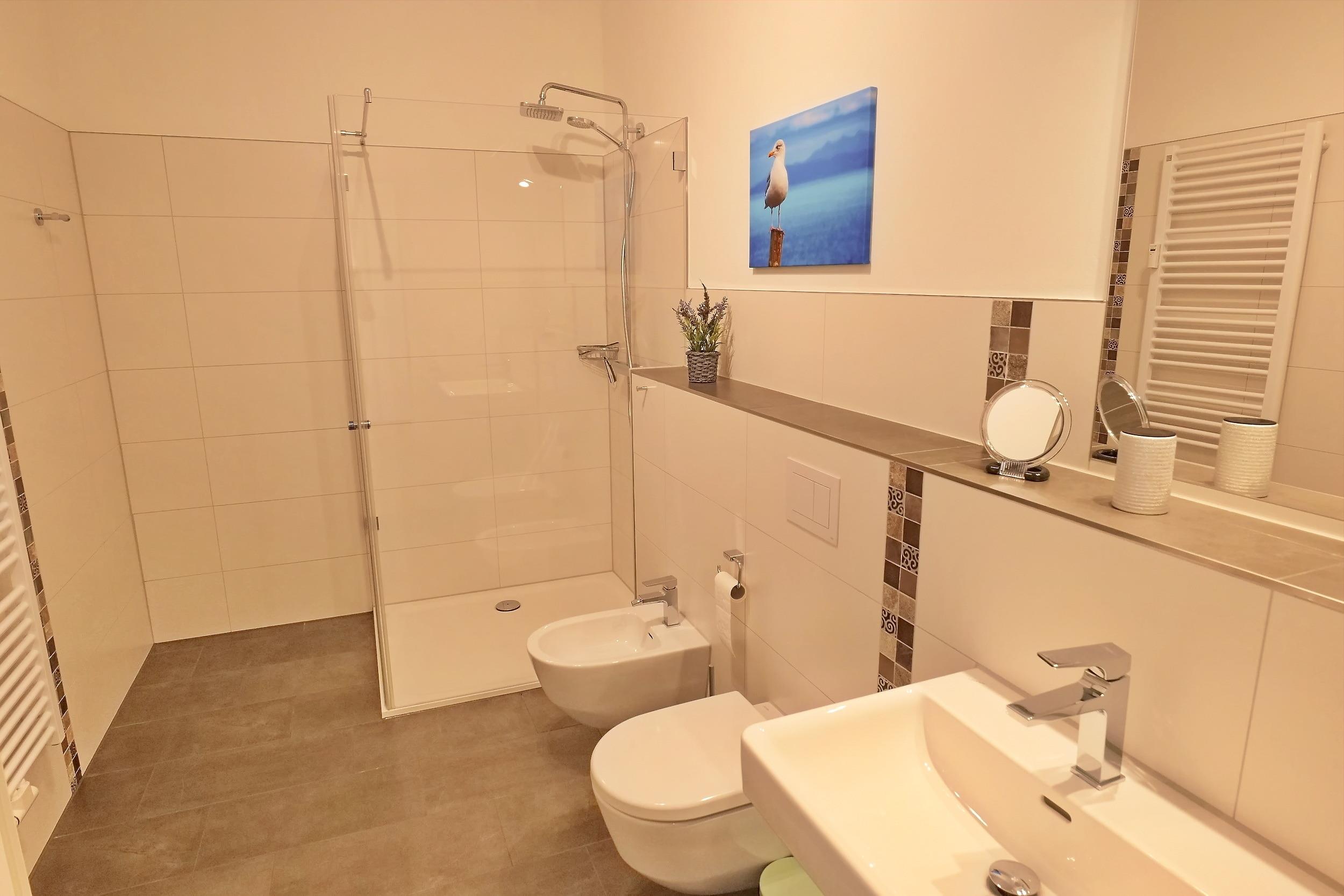 - Badezimmer mit großzügiger Dusche, WC und Bidet
