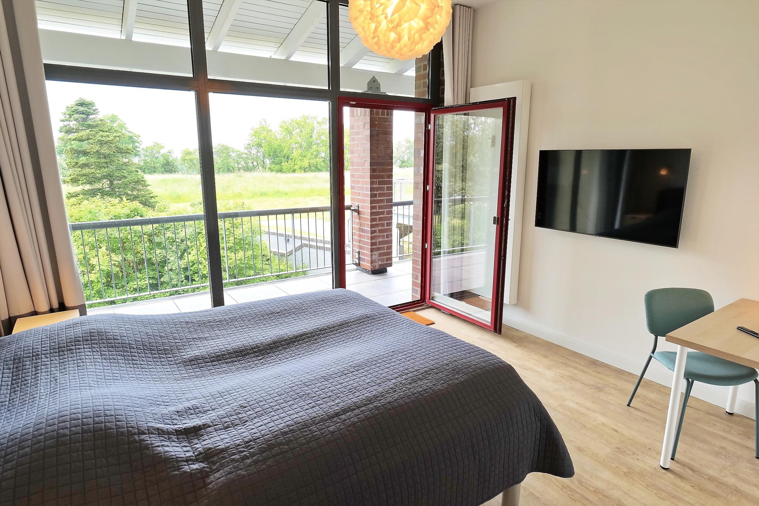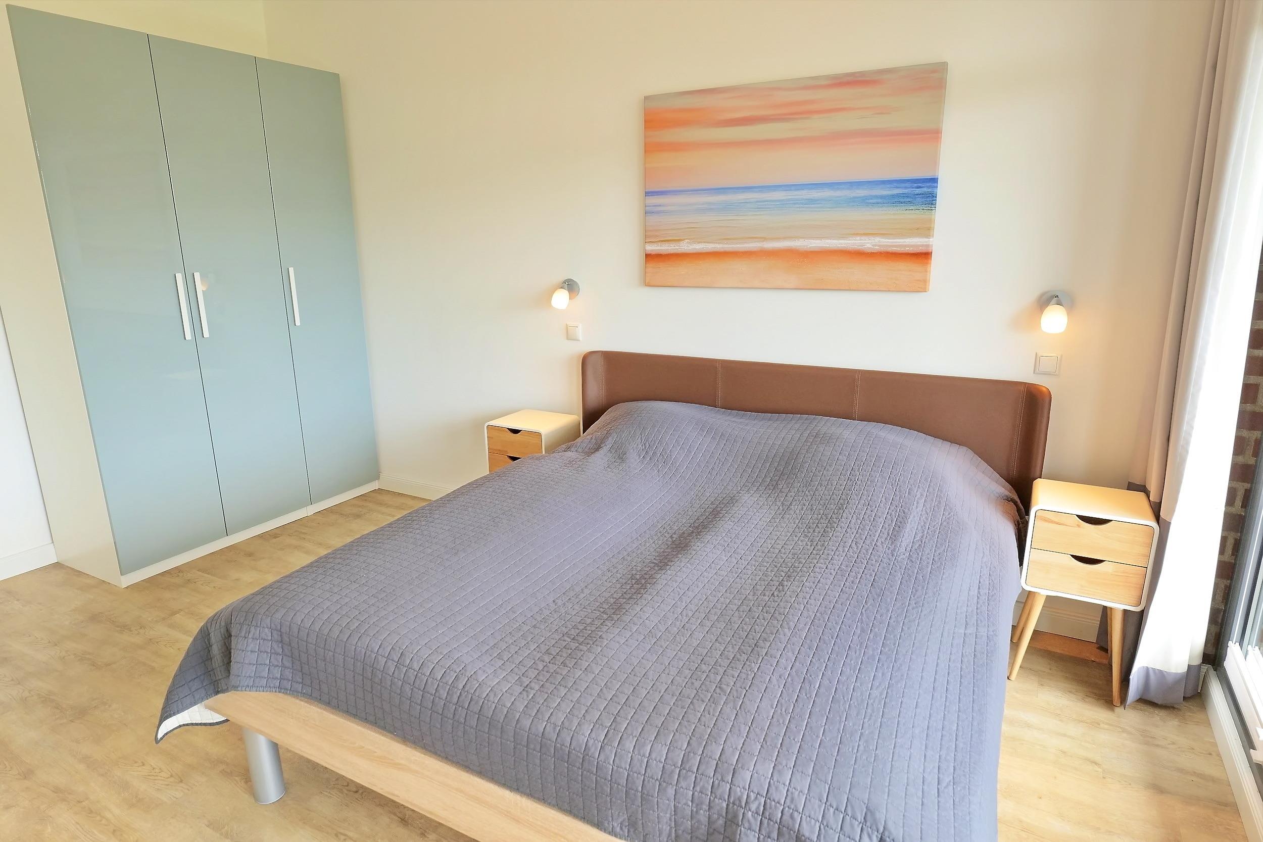 - Schlafzimmer mit Doppelbett (2,0 x 1,80 – getrennte Matratzen á zweimal 90 x 200 cm), Fernseher, großer Kleiderschrank und Schreibtisch