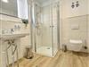 Das ebenerdige Badezimmer mit Dusche, Waschtisch, Spiegel und WC ist modern gestaltet. Hier verbringt man gerne etwas länger Zeit, um sich für den anbrechenden Tag vorzubereiten.
