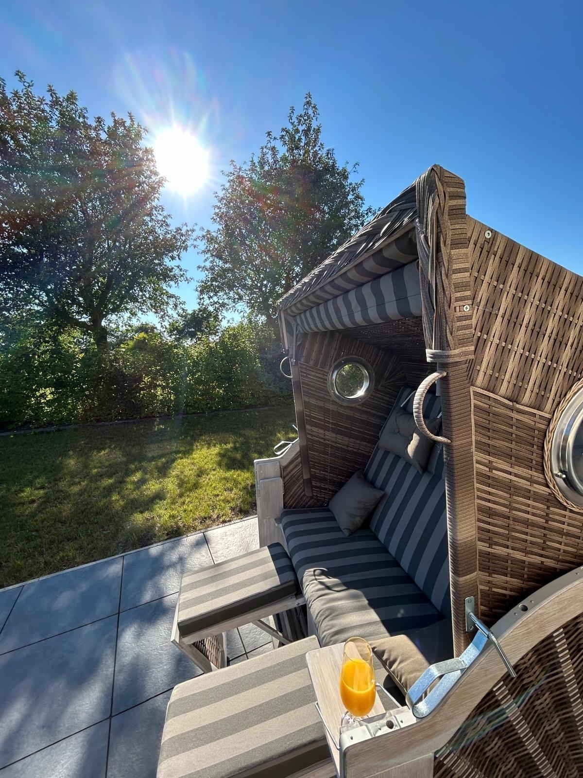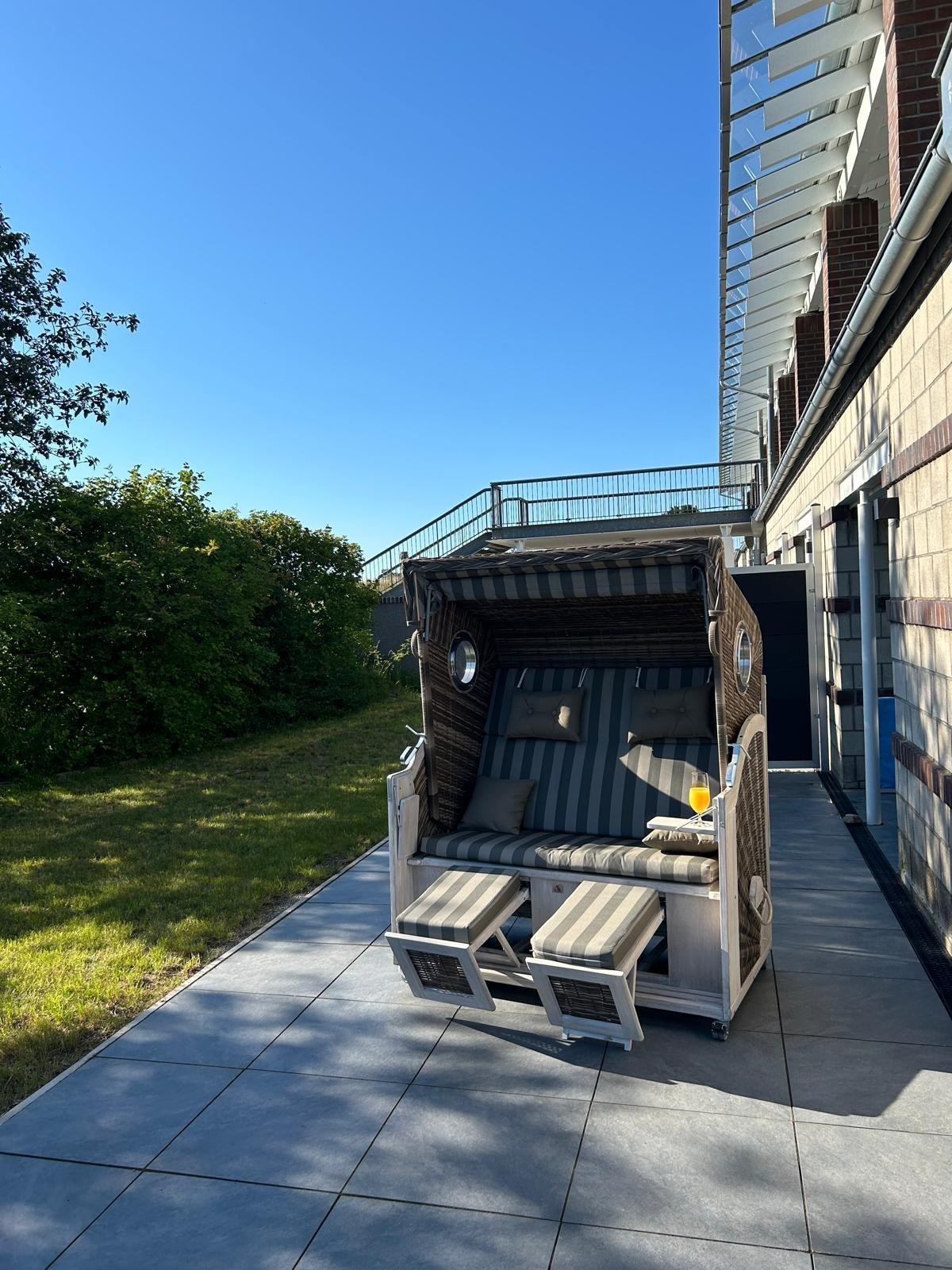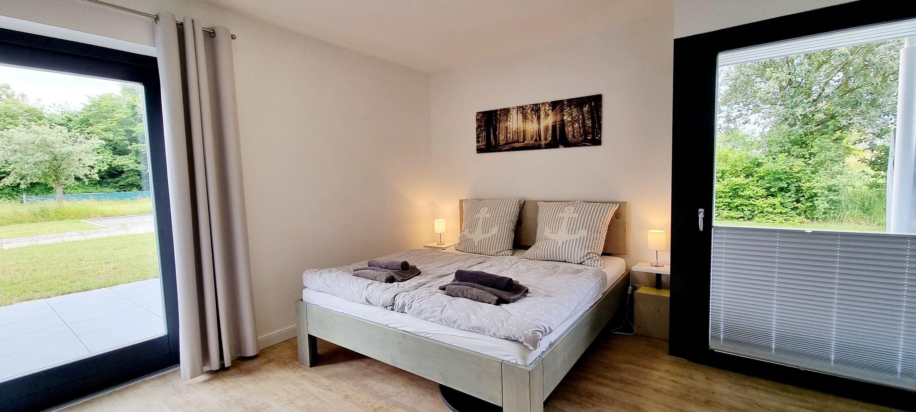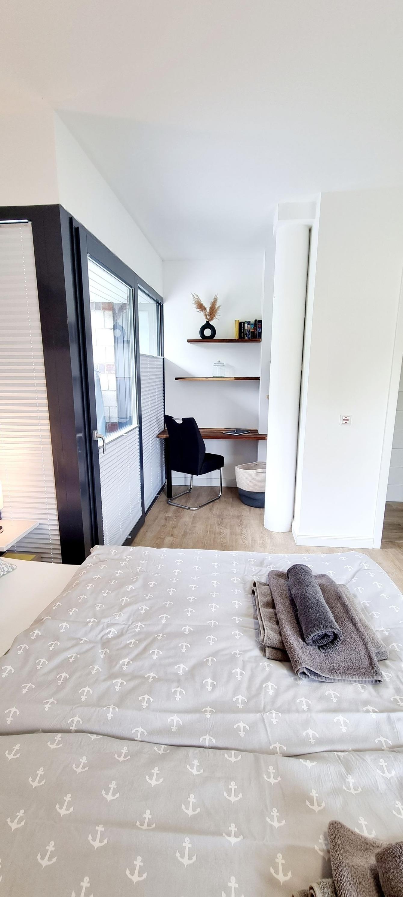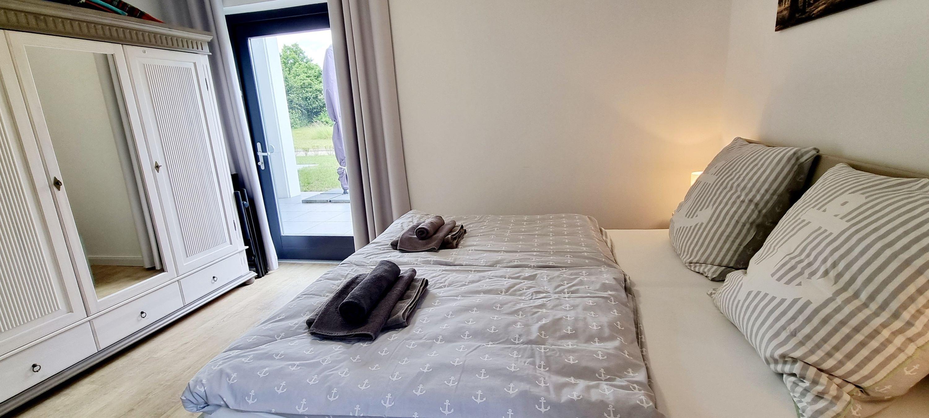 Ihr Schlafzimmer ist mit einem bequemen Doppelbett, Nachttische und ein großer Kleiderschrank für Ihre Urlaubsgarderobe, sowie einem Schreibtisch ausgestattet. Von hier aus haben Sie direkten Zugang zur Süd-Westterrasse. Dort können Sie Ihren ersten Kaffee im Strandkorb genießen.