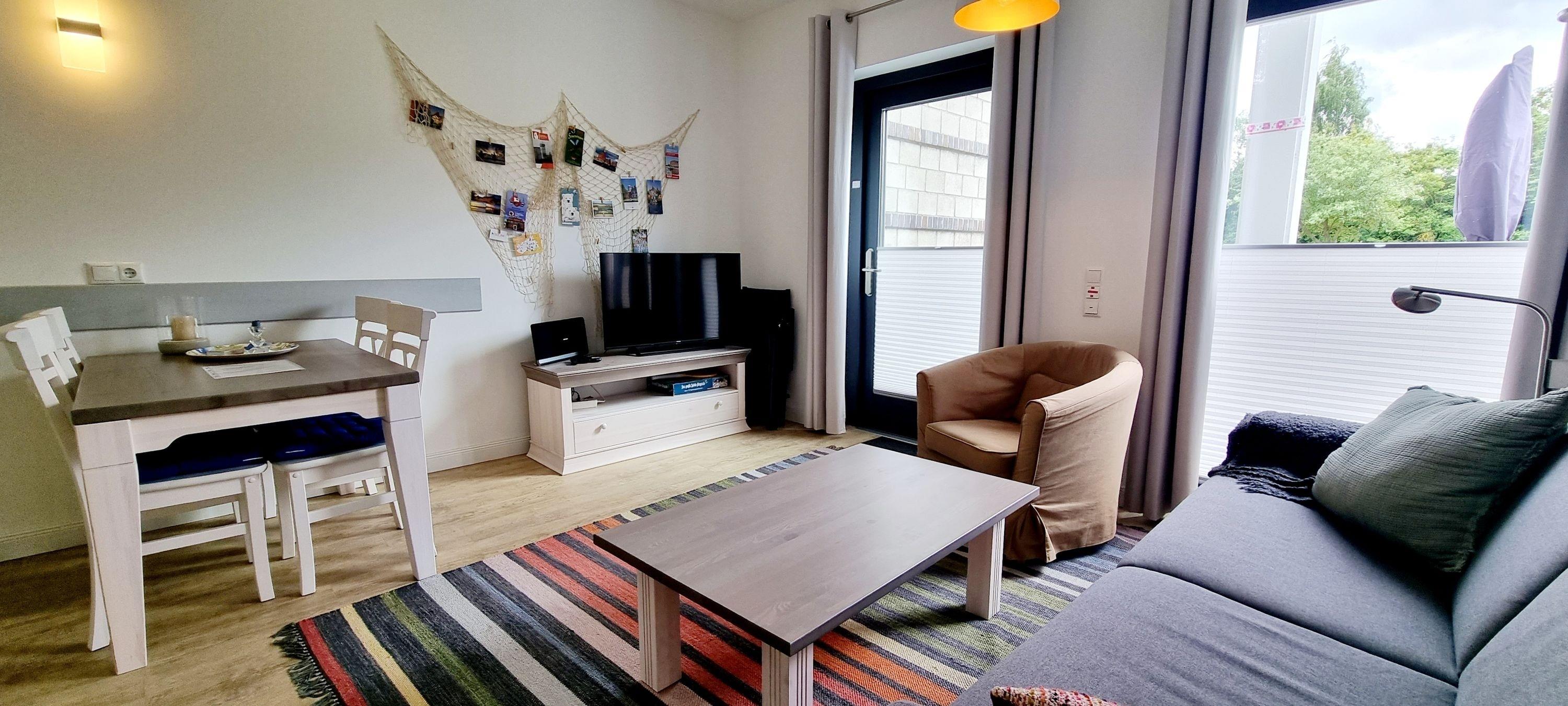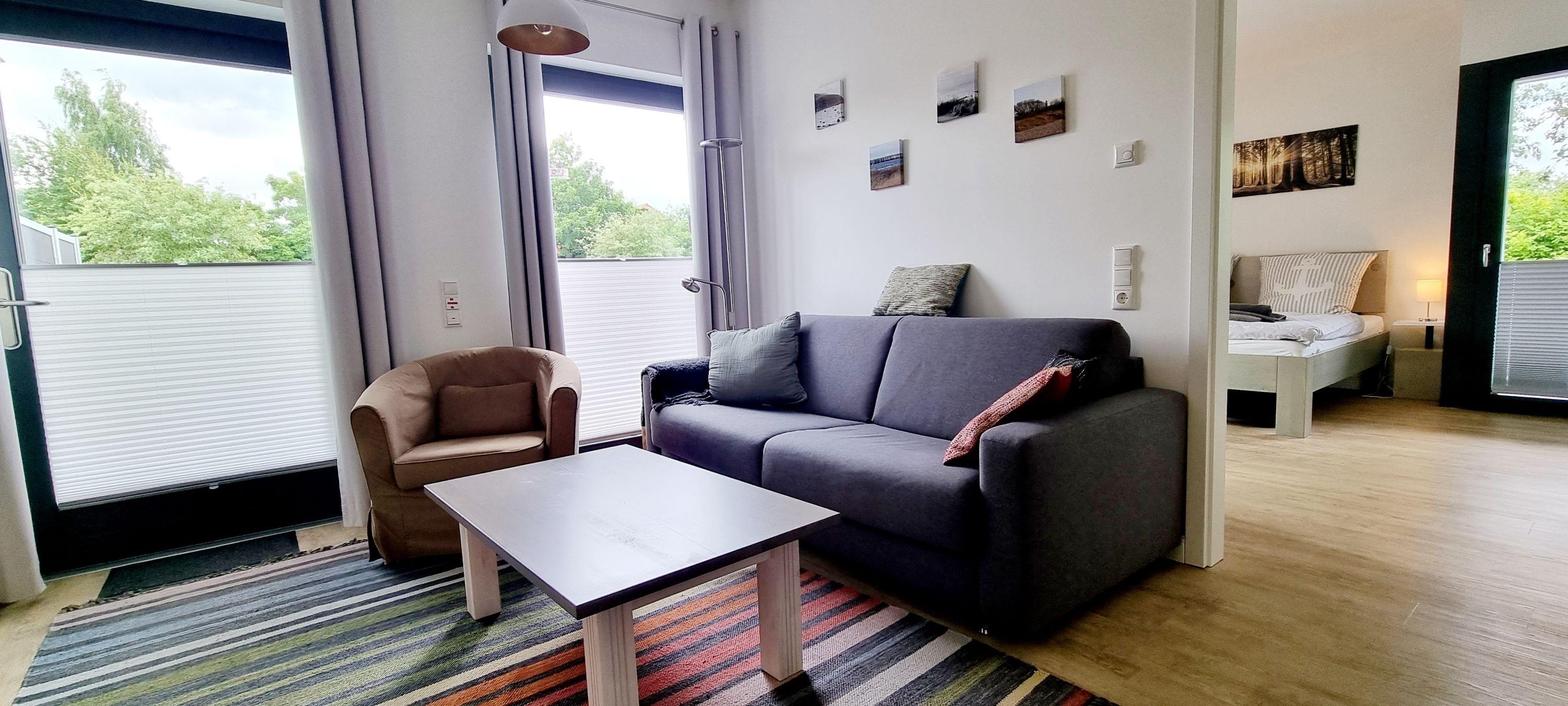 Das geräumige und helle Wohnzimmer mit direktem Zugang zur Terrasse empfängt Sie mit einer gemütlichen Sitzecke mit (Schlaf-)Couch, Sessel und Tisch. Ein großes TV-Gerät und eine Hifi-Anlage gehören ebenso zur Ausstattung. [nbsp]