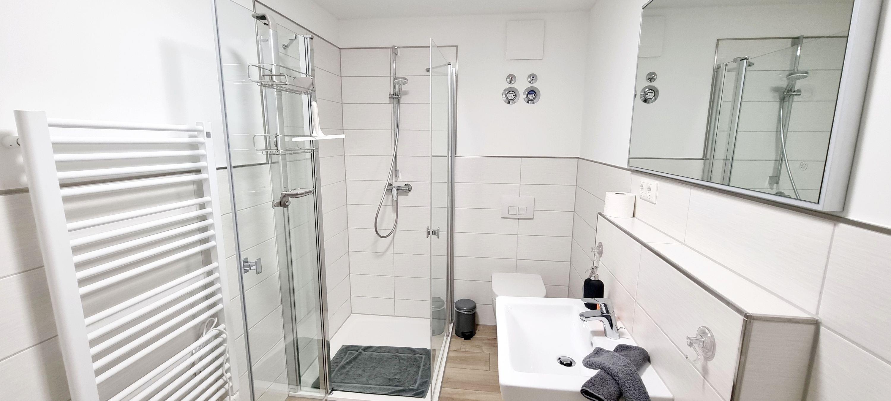 Das helle Badezimmer besticht mit einer bodengleichen Dusche, WC und großem Waschbecken. Der beleuchtete Spiegel, ein Vergrößerungsspiegel, sowie diverse Ablagemöglichkeiten sind ebenso selbstverständlich wie ein Fön.