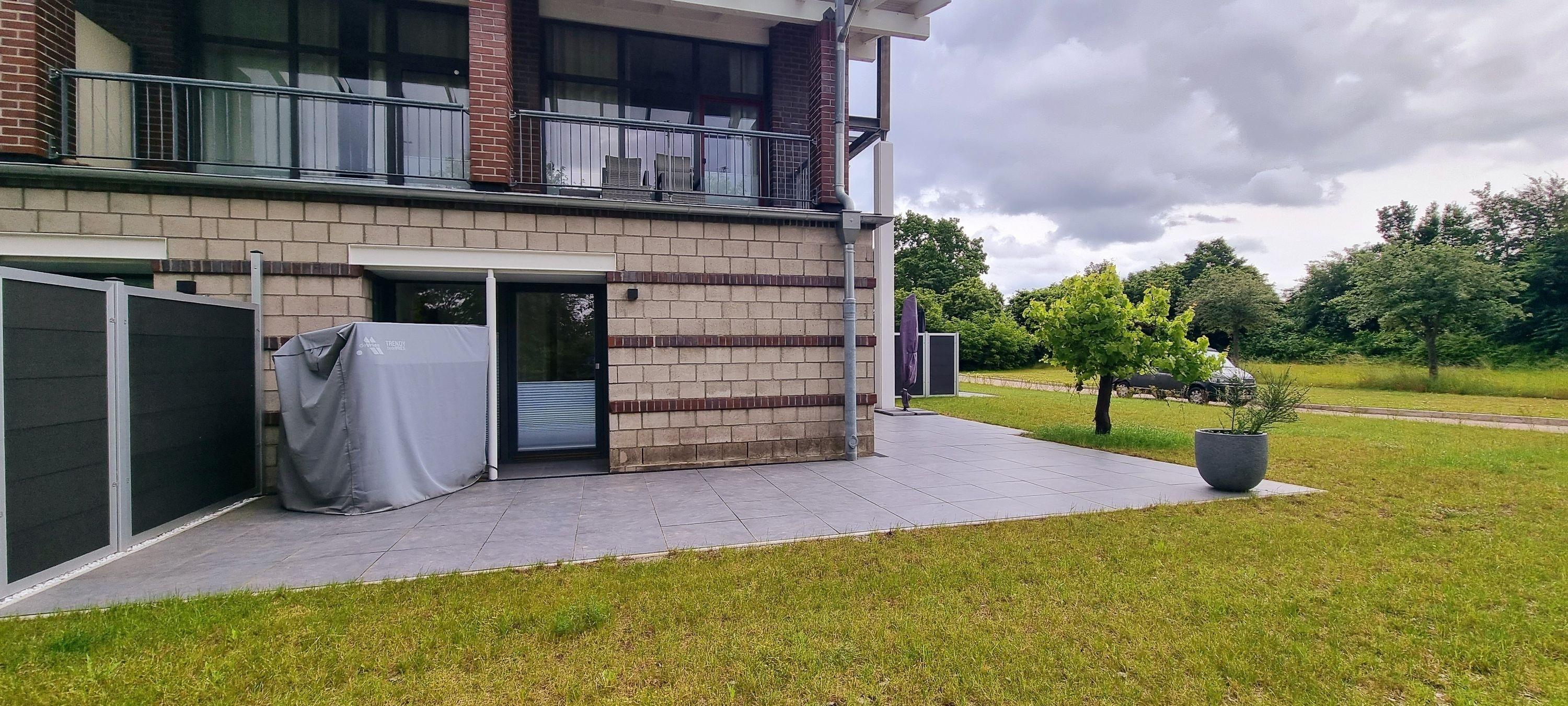 Die großzügige überdachte Terrasse mit Sitzgruppe und Sonnenschirm bietet direkten Zugang zum Garten.