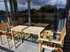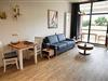 Im Wohnraum befinden sich zudem ein Küchentisch mit drei Stühlen, ein Wohn- und Schlafsofa mit einer guten Schlafmatratze, ein Couchtisch, Beistelltische, ein Sideboard, eine Vitrine, ein Sekretär und ein Flachbildschirmfernseher (Magenta-TV) mit einer Stereoanlage. Vom überdachten Balkon zur Westseite hat man einen weiten Blick zur Ostsee. Hier stehen ein Balkontisch und zwei Stühle zur Verfügung.