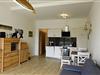 Die Wohnung verfügt über eine moderne und vollständig ausgestattete Einbauküche, die sich im Wohnraum befindet. Die Küchenarbeitsplatte besteht aus Naturstein und es sind reichlich Geschirr, Gläser und Töpfe vorhanden. Außerdem stehen eine Geschirrspülmaschine, Miele-Herdplatten, ein Miele-Backofen, eine Kaffeemaschine, ein Toaster, ein Wasserkocher und ein Handrührgerät zur Verfügung.