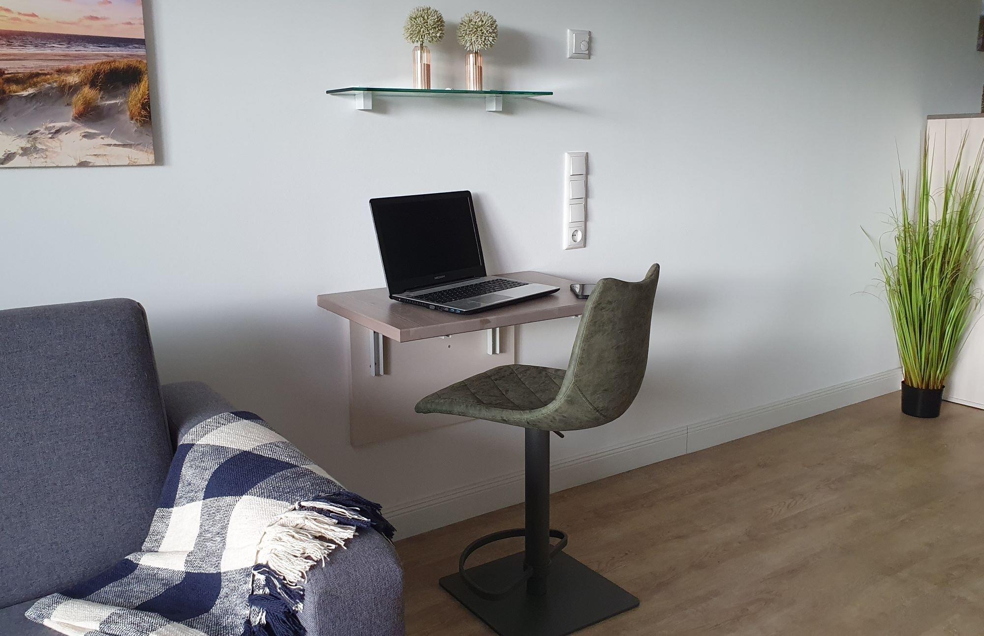 Am Schreibtisch können Sie zwischendurch Ihre E-Mails checken oder ihn als kleinen Arbeitsplatz nutzen. Freies W-LAN ist in der Appartementanlage gegeben.