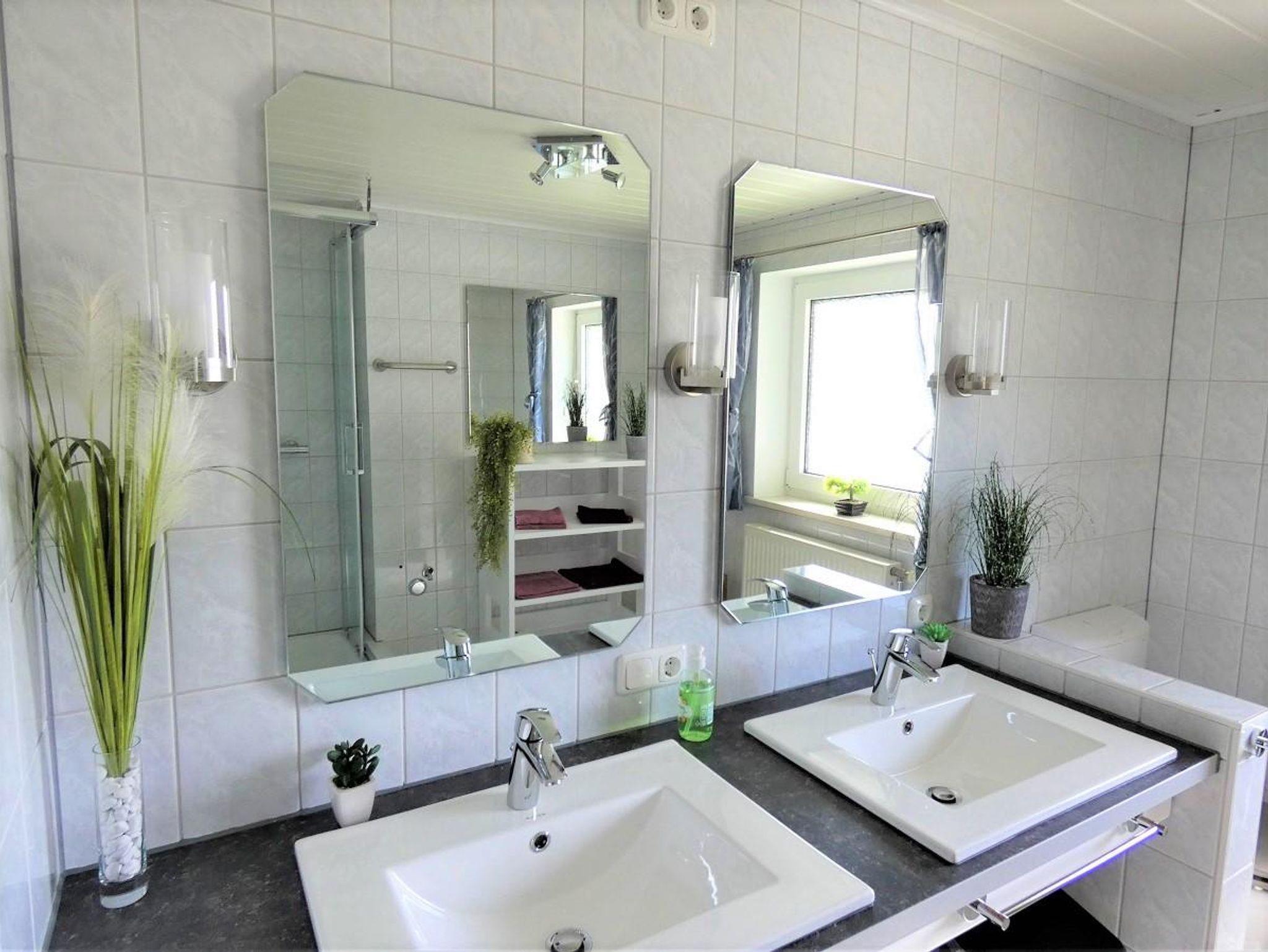 dazugestellt werden. Das geräumige Badezimmer ist mit Dusche, 2 Waschbecken und WC