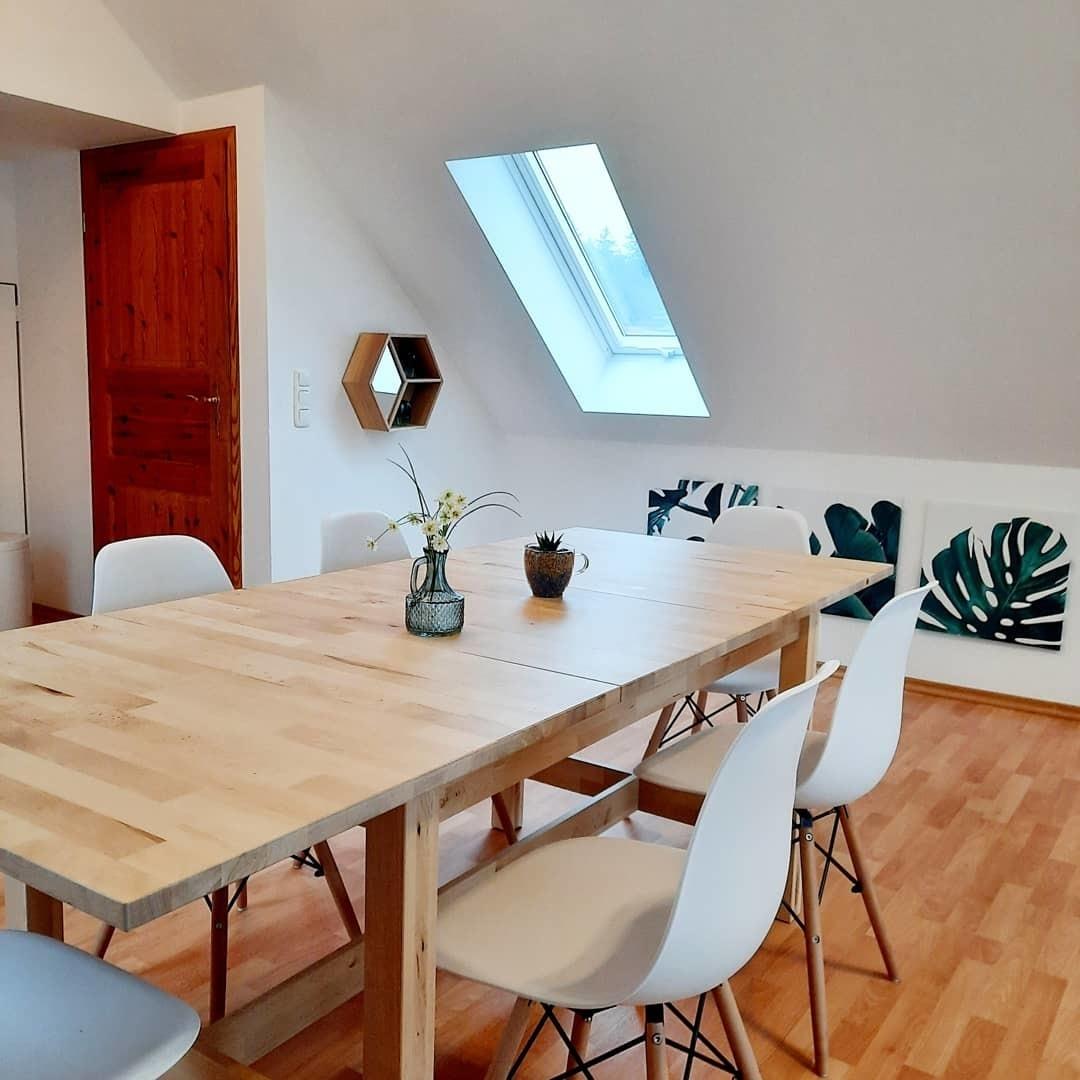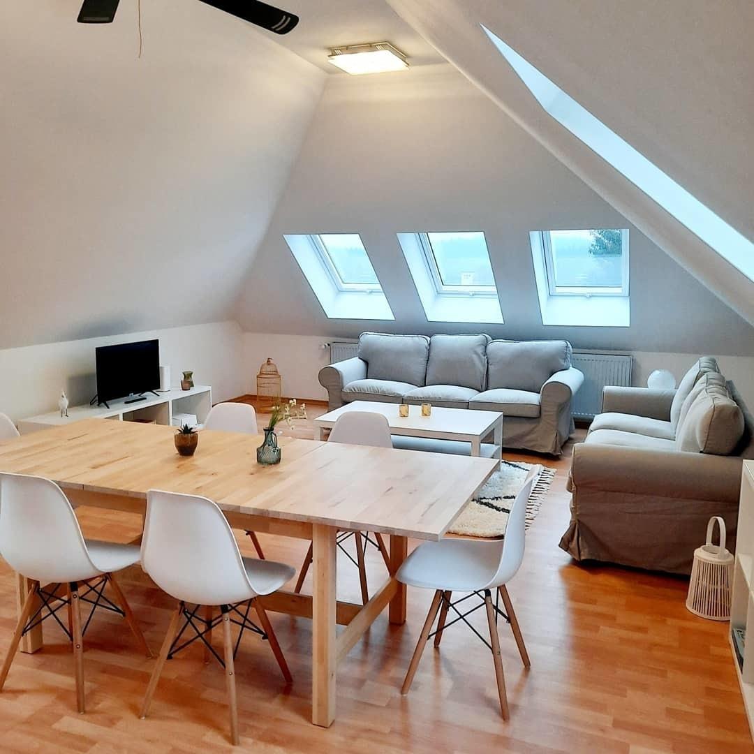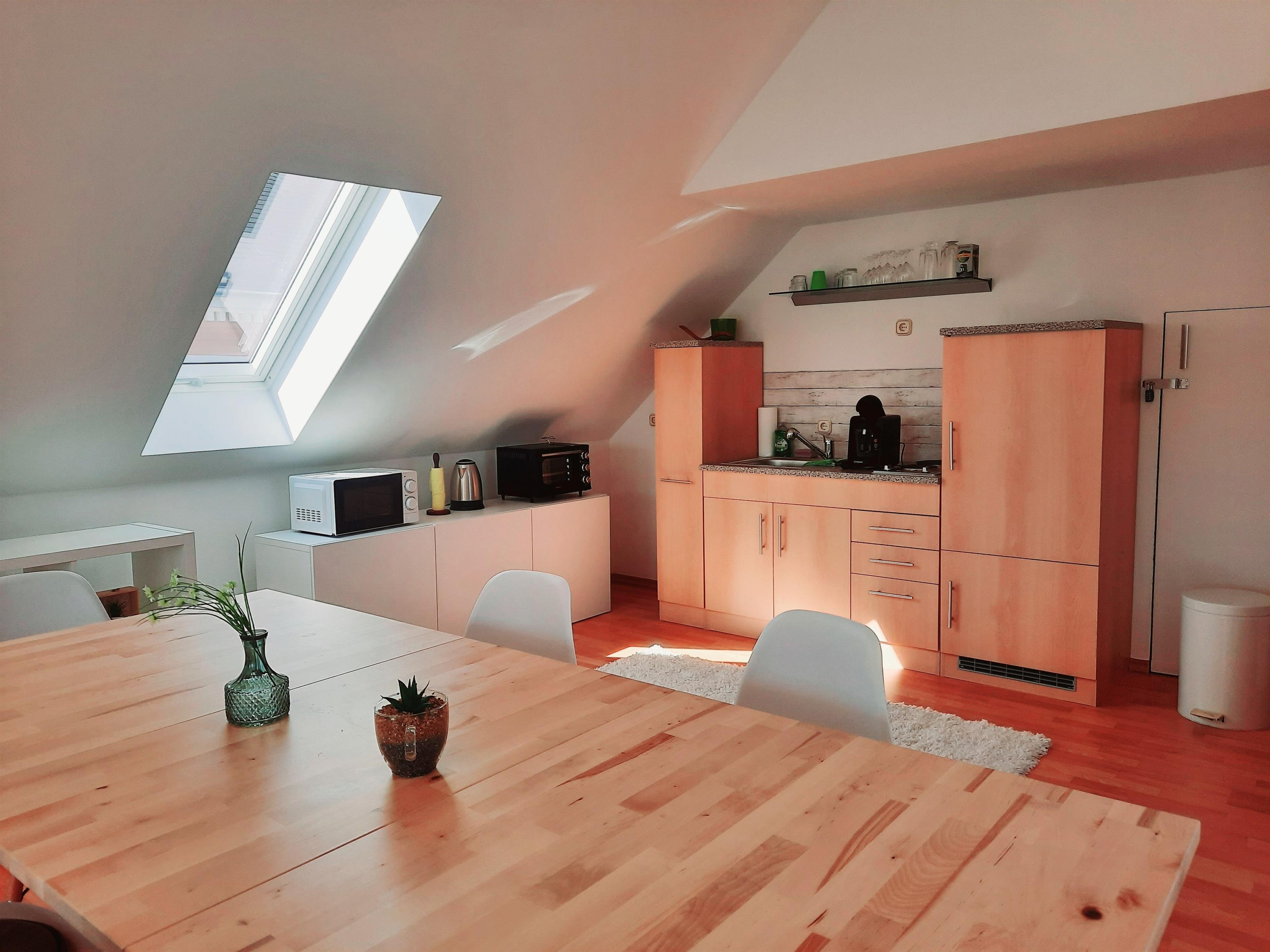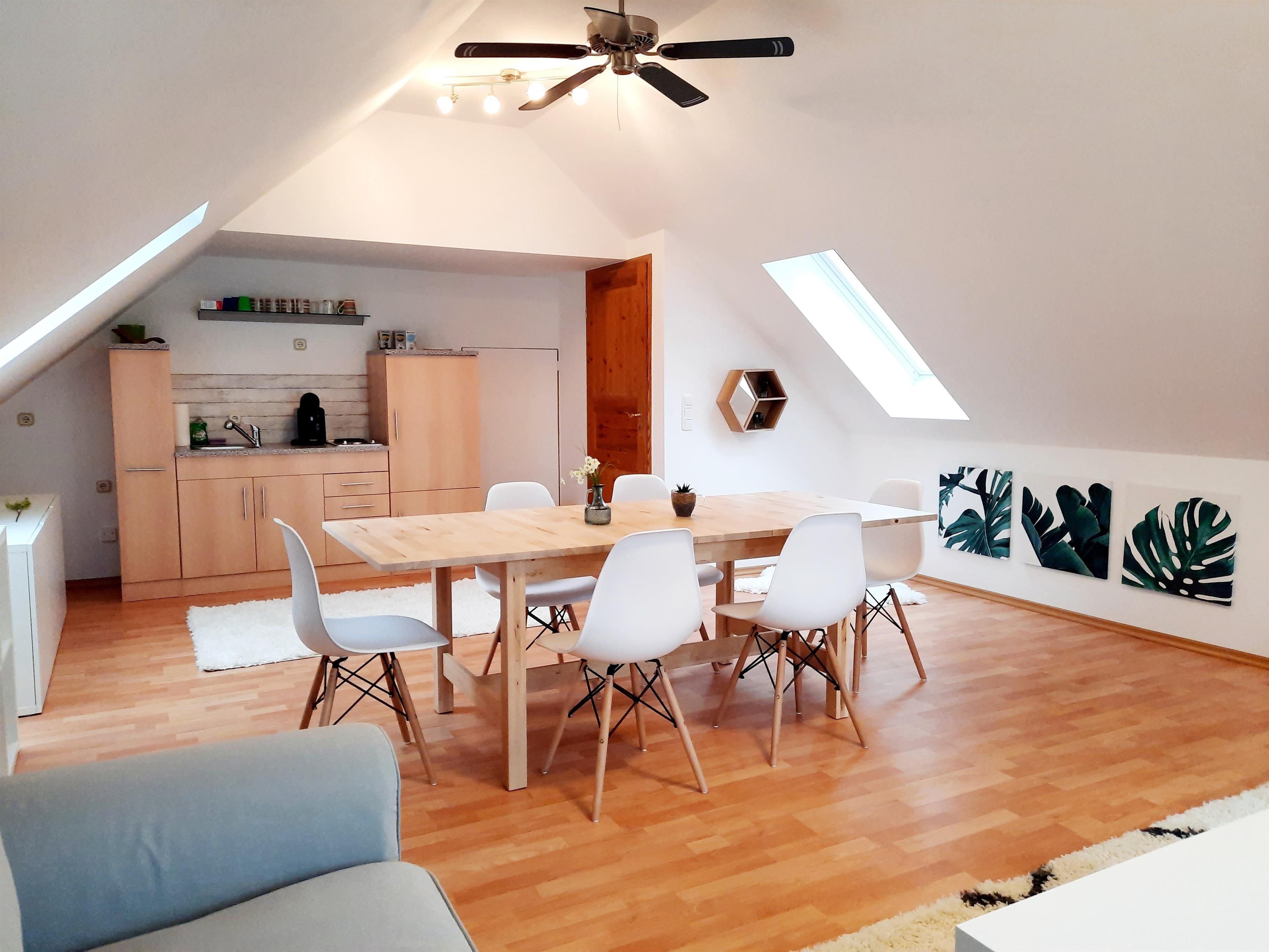 Die Wohnung ist modern und hell eingerichtet. Der Wohnbereich im Dachgeschoss hat große Dachflächenfenster, die viel Licht in die Räume bringen und im Sommer ein tolles Cabrio Feeling bieten.