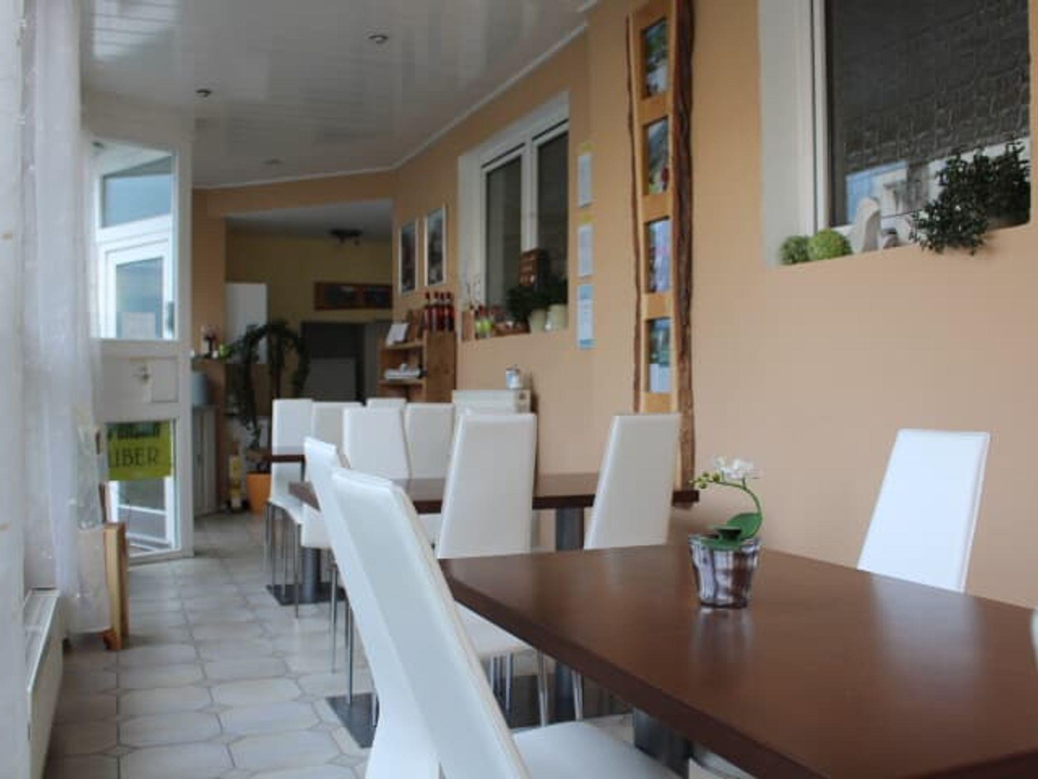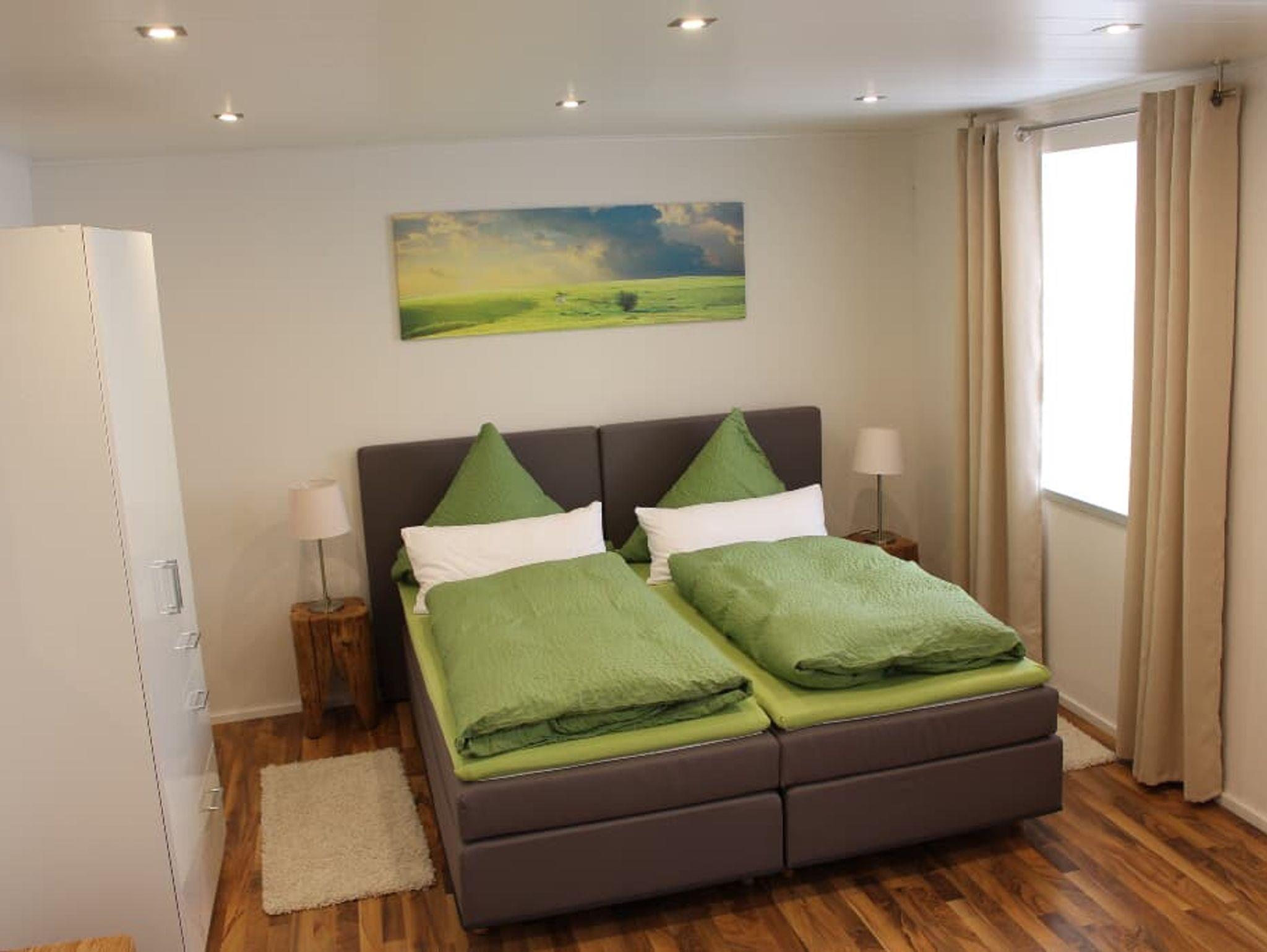 Unsere große Ferienwohnung Fledermaus liegt im Haupthaus und verfügt über einen seperaten Eingang. Die Wohnung ist für bis zu 6 Personen geeignet und besteht aus zwei Schalfzimmern mit gemütlichem Doppelbett, einem Bad (WC,Dusche), einem Wohn-/Essbereich mit großer Eckcouch und großem Esstisch. Die Küche ist modern und vollausgestattet, mit Backofen, Herd, Kühlschrank, Mikrowelle, Kaffeemaschine, Toaster und Spülmaschine. Sie dürfen ausserdem gerne den Saunabereich, den Pool und unseren Fitnessraum benutzen.