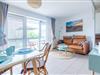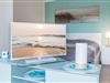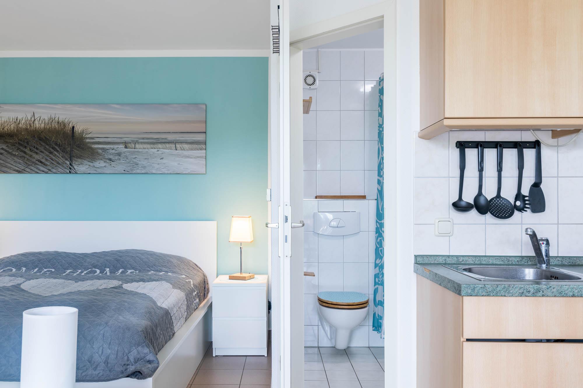 Wohn, Schlaf- und Essbereich sind offen miteinander verbunden, eine kleine Singleküche mit angeschlossener Essecke reihen sich hervorragend ein. Die moderne und gemütliche Einrichtung sorgt mit ihren frischen Meeresfarben für herrliche Urlaubsstimmung. Der Flatscreen-TV befindet sich mittig zwischen dem Wohnbereich und Schlafbereich und kann somit durch einfaches Drehen von beiden Bereichen genutzt werden. Die bequeme Couch bietet bei Bedarf eine dritte Schlafmöglichkeit.