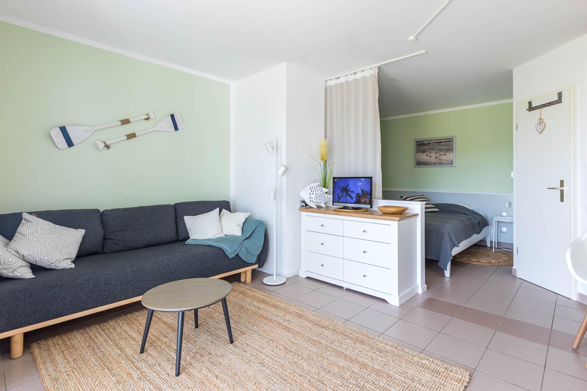 Wohn, Schlaf- und Essbereich sind offen miteinander verbunden, eine kleine Singleküche mit angeschlossener Essecke reihen sich hervorragend ein. Die moderne und gemütliche Einrichtung sorgt mit ihren harmonisch abgestimmten Farben für herrliche Urlaubsstimmung. Der Flatscreen-TV befindet sich mittig zwischen dem Wohnbereich und Schlafbereich. Auf der bequemen Couch könnte bei Bedarf ein Kind schlafen.