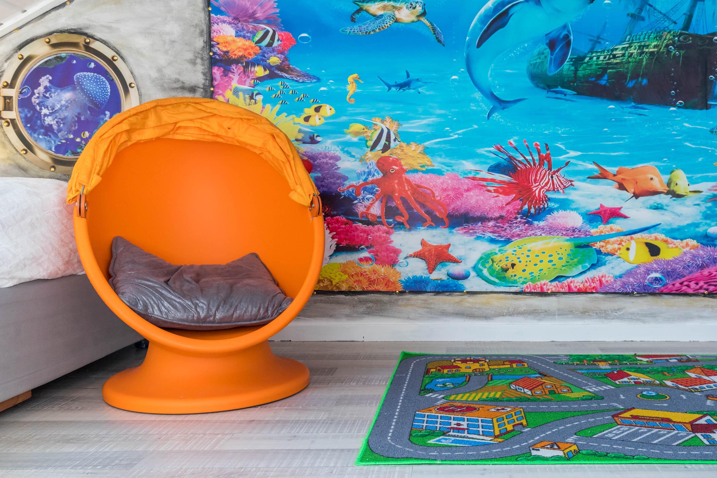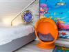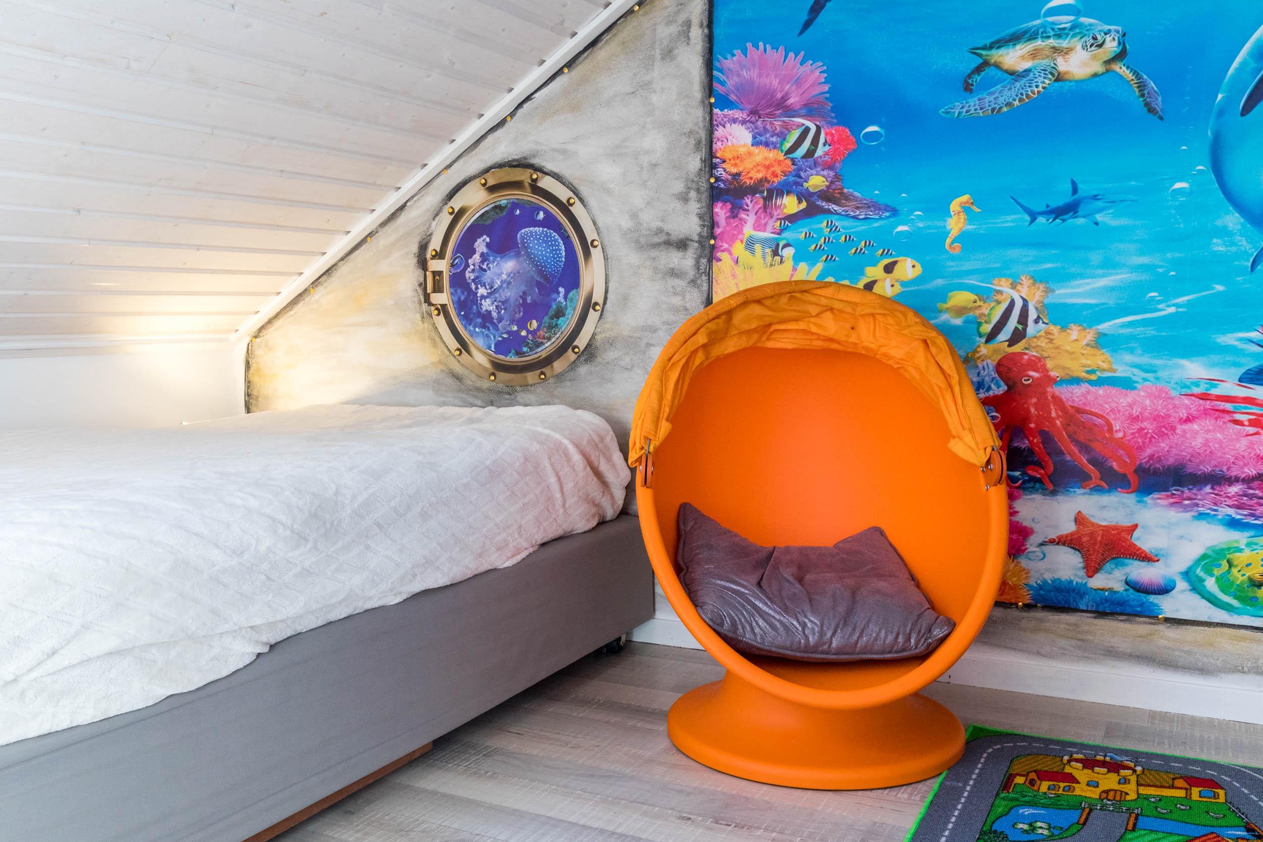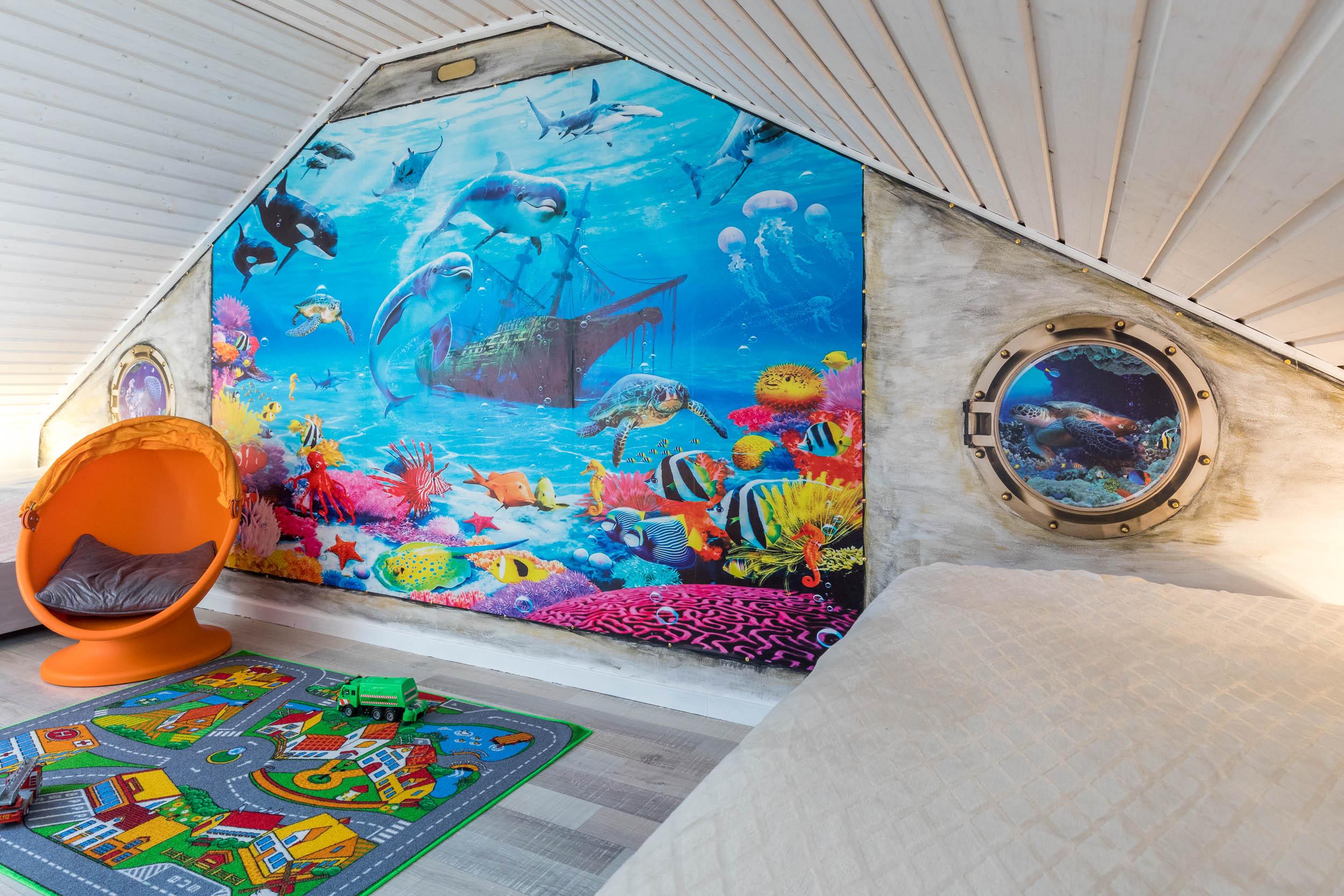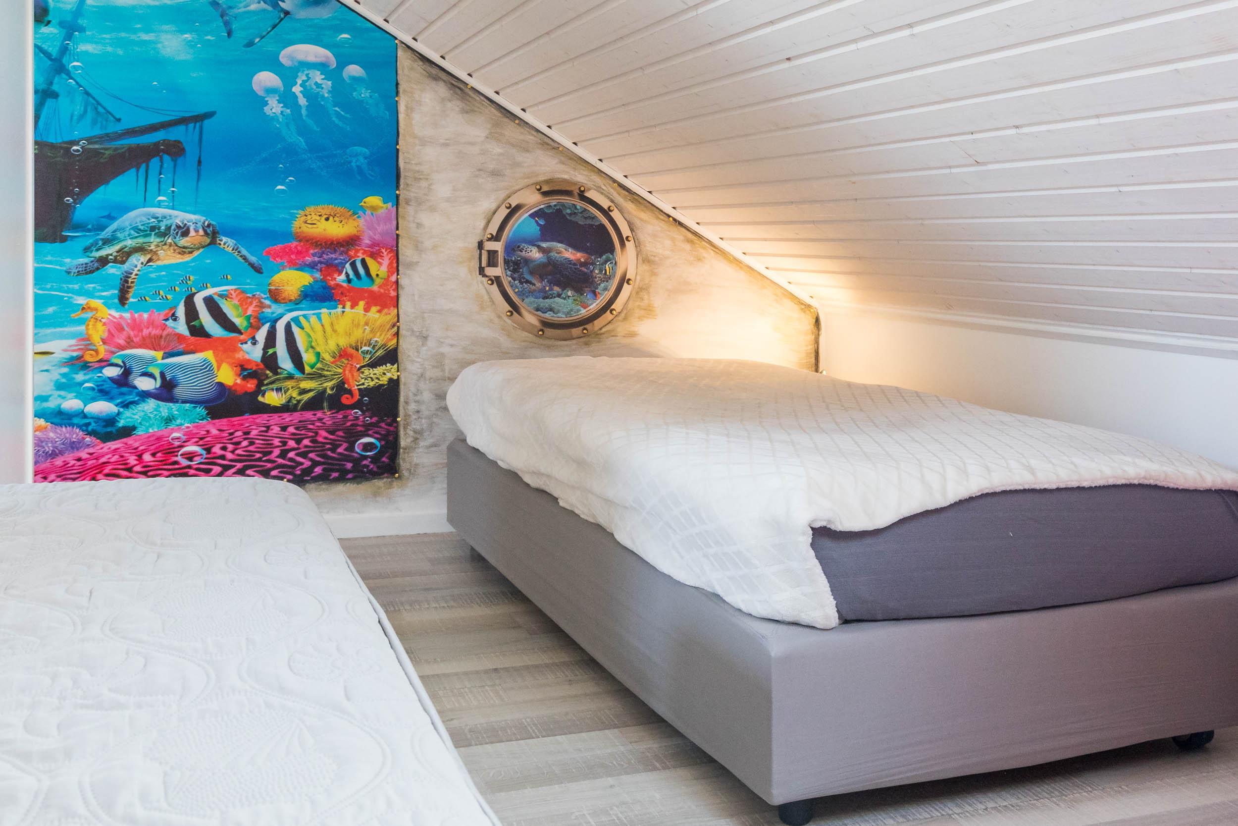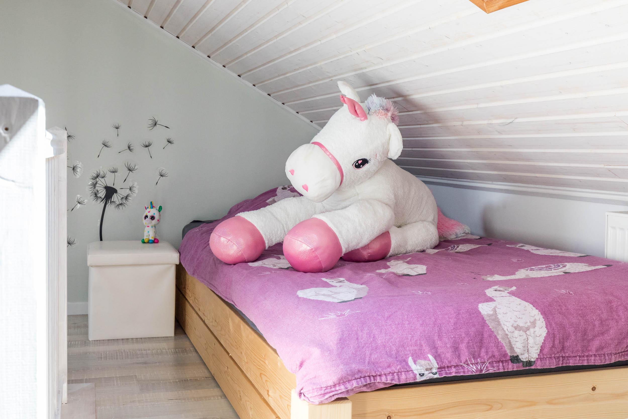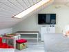 Das Schlafzimmer ist mit einem Doppelbett und einem geräumigen Kleiderschrank ausgestattet. Außerdem ist ausreichend Platz für das Babybett. Vom Wohnbereich aus gelangen Sie über eine Raumspartreppe ins offene Dachgeschoss. Dieser Bereich ist eher für größere Kinder geeignet. Hier stehen 3 Einzelbetten und ein Sofa bereit. Ein eigener Flatscreen-TV an der Wand sorgt auch auf dieser Etage für Unterhaltung.