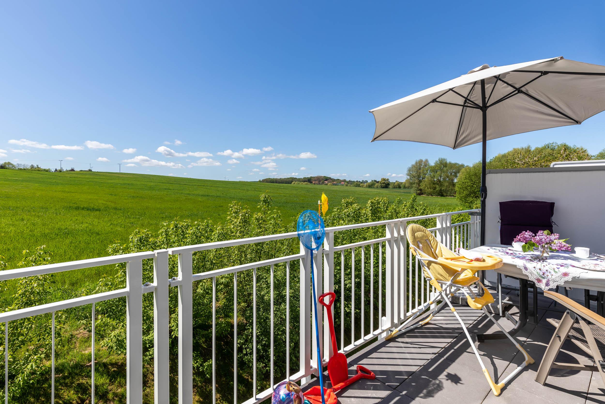 Von hier aus begehen Sie auch den möblierten Südbalkon mit Blick ins Grüne.