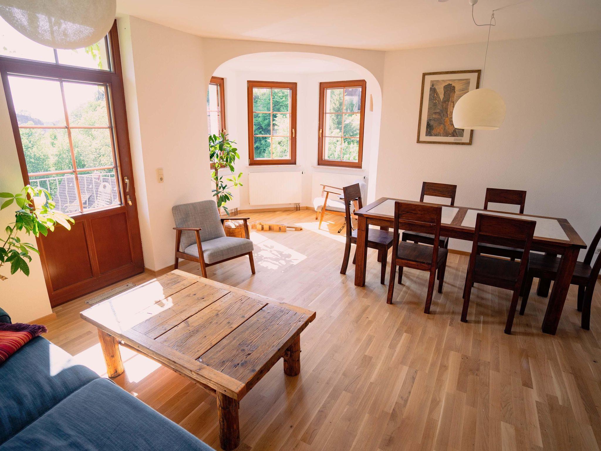 Die Wohnung liegt ebenerdig und hat ein wunderschönes lichtdurchflutetes Wohnzimmer, eine angenehme helle Küche, einen großzügigen Flur mit einer individuellen gestalteten Garderobe aus Waldholz und ein Tageslichtbad mit Dusche und Badewanne. Das Wohnzimmer besticht mit seinem Erker und dem Balkon, von welchen ein traumhafter Blick auf die Felsen, den Bärengarten und die Burg Hohnstein geboten wird. Die Wohnung wurde 2024 renoviert und mit Echtholzmöbeln und -Fußboden ausgestattet.
