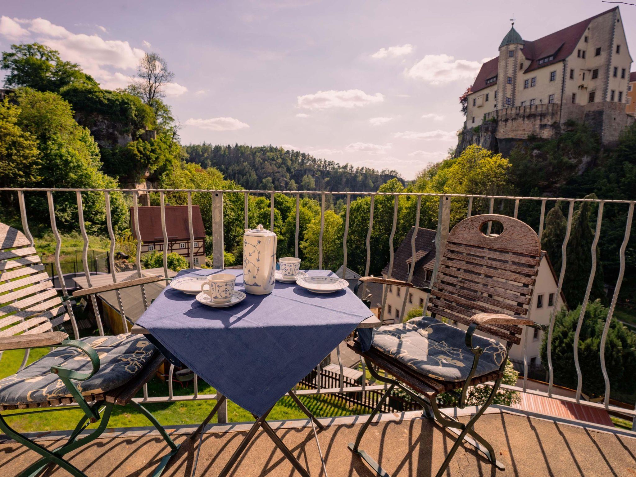 Es ist die Aussicht auf Burg und Felsenlandschaft des Nationalparks, die den Aufenthalt in unserer Ferienwohnung einmalig gestaltet. Vom Balkon sowie fast allen Zimmer hat man einen direkten Blick über den historischen Bärengarten, auf die Burg Hohnstein, das Felsenmassiv mit dem Gipfel Großer Halben und auch den berühmten Malerweg.