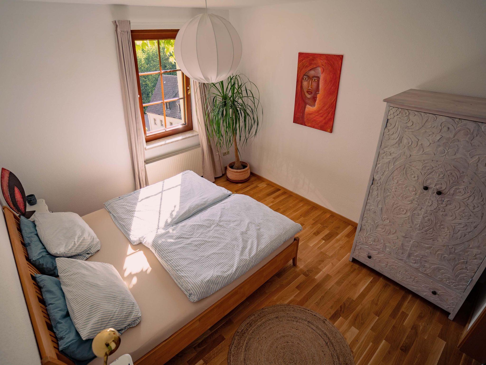 - Das Schlafzimmer „Rathaus“ mit Doppelbett sowie die Möglichkeit eine Matratze für 1 Kind bis 12 Jahre bereitzustellen