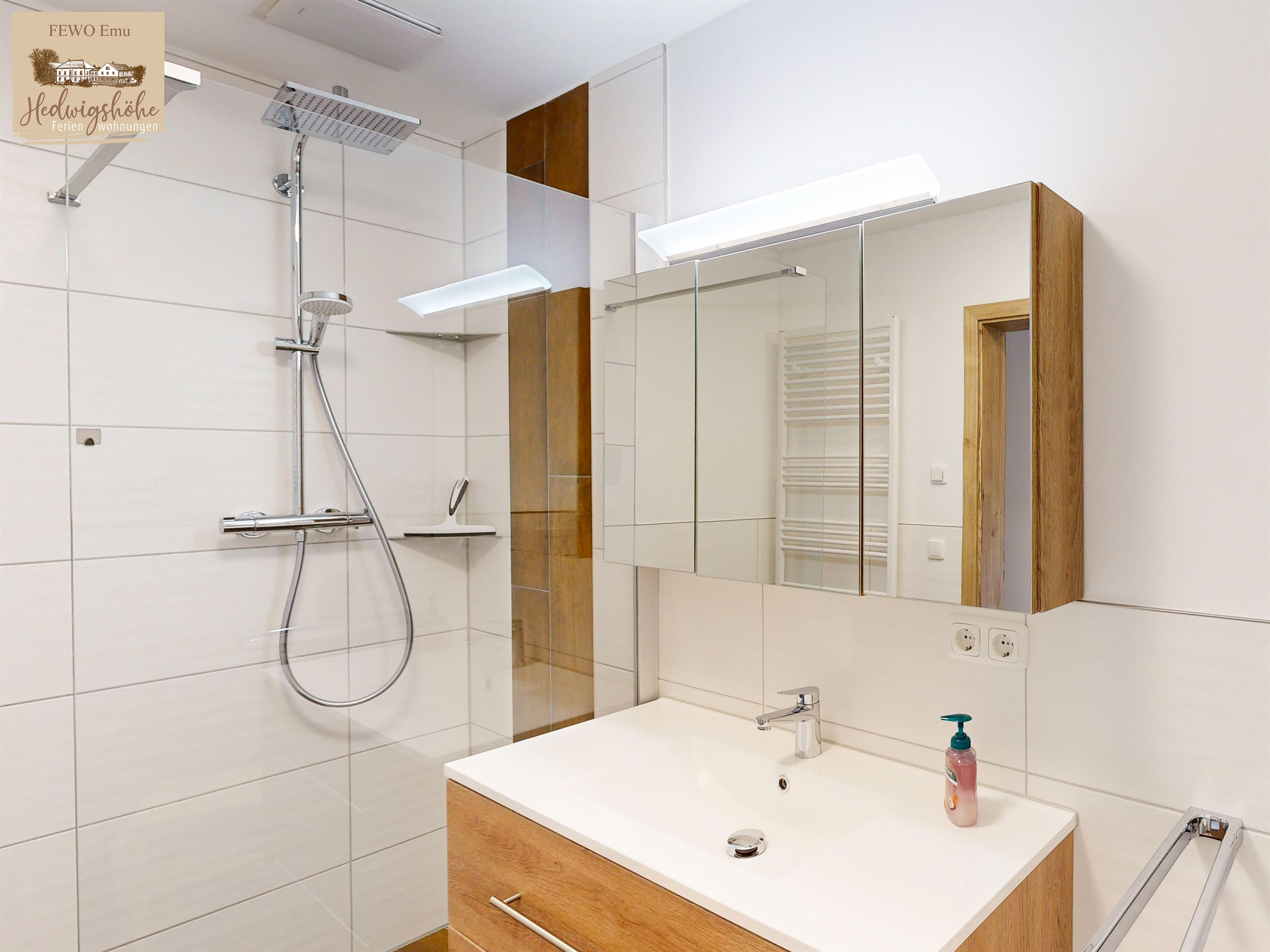 Ausstattung: Bodengleiche Regenwalddusche, Spiegelschrank und Waschtisch.