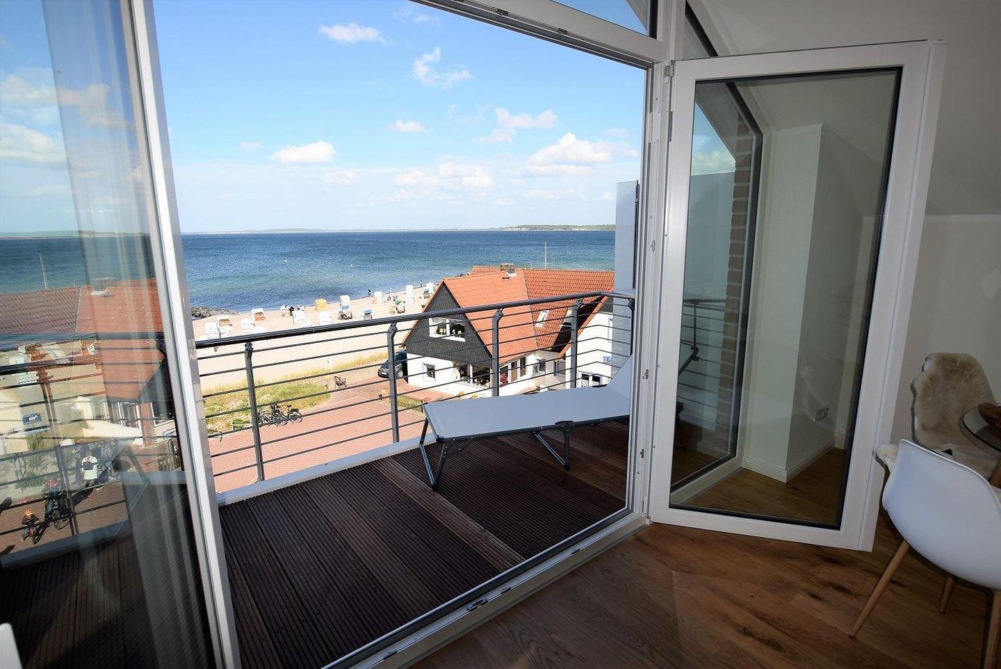 Direkt vom Wohnraum aus kann der schöne Balkon der Wohnung betreten werden. Hier kann nicht nur die Aussicht auf die mal ruhige, mal schäumende See genossen werden, sondern auch ein fantastischer Panoramablick über die ganze Bucht. Durch seine Lage bietet der Außenbereich pünktlich zum Frühstück Sonne, die sich den ganzen Tag über hält.