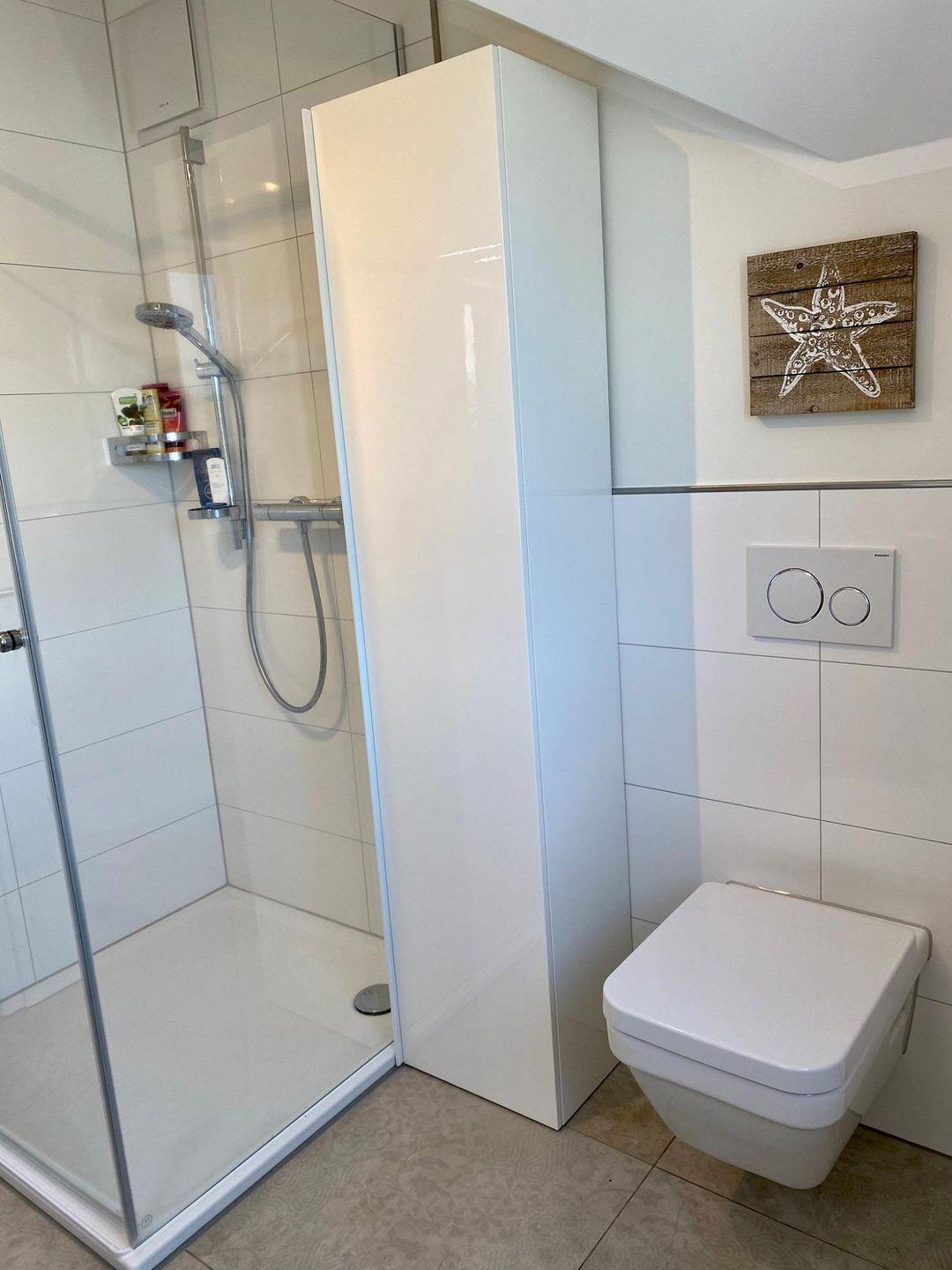 In der Wohnung steht Ihnen ein Badezimmer mit bodentiefer Dusche zur Verfügung. Helle Fliesen sorgen für einen modernen Gesamteindruck. Deckenspots, ein Waschtisch mit großem Spiegel und ein Fön sind hier ebenso vorhanden wie ein Handtuchwärmer.