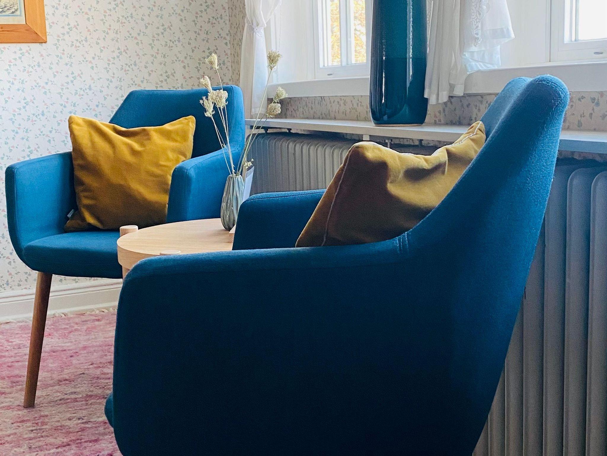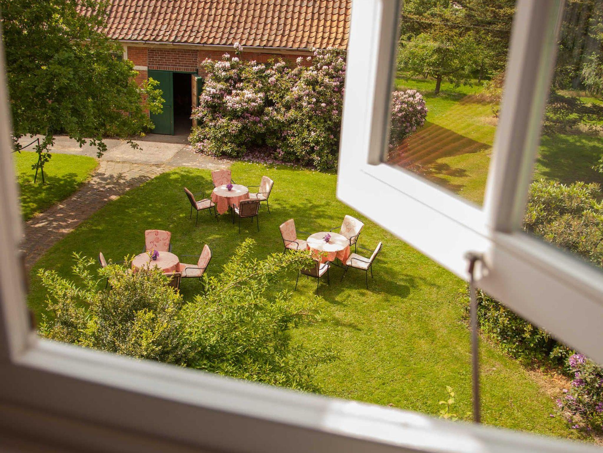 Vor einem Giebelfenster laden Tisch und gemütliche Sessel zum Genießen und Verweilen ein.