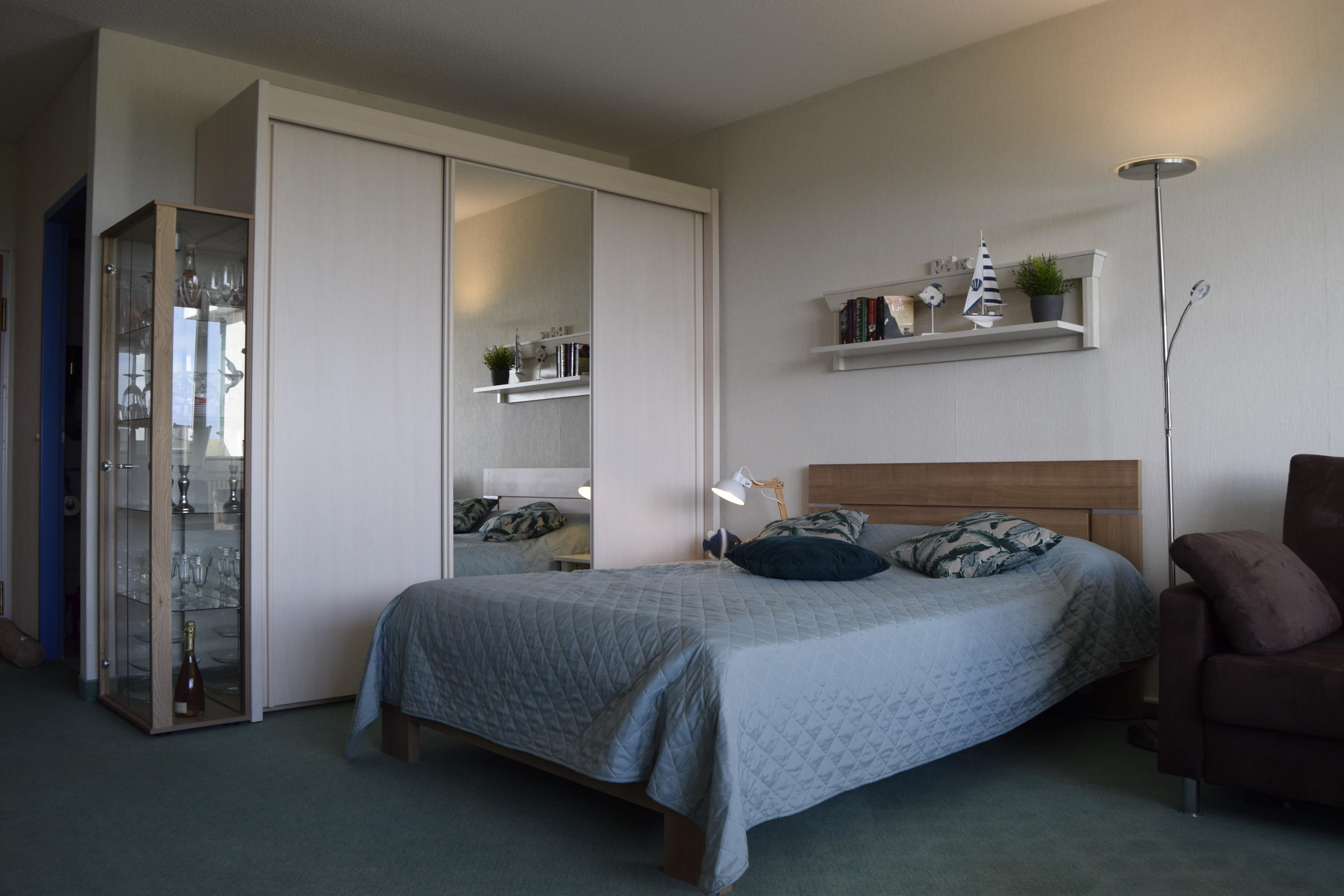 Auf dem Balkon mit gemütlicher Essecke können Sie Ihr Frühstück bei einem wunderschönen Weitblick auf die Ostsee, über Kalifornien und den Schönberger Strand genießen. Das Appartement verfügt über einen kombinierten Wohn-/Schlafbereich mit neuem Doppelbett (1,40 x 2,00m), zwei Sofas, eine Küchenzeile mit Essbereich sowie ein Duschbad.
