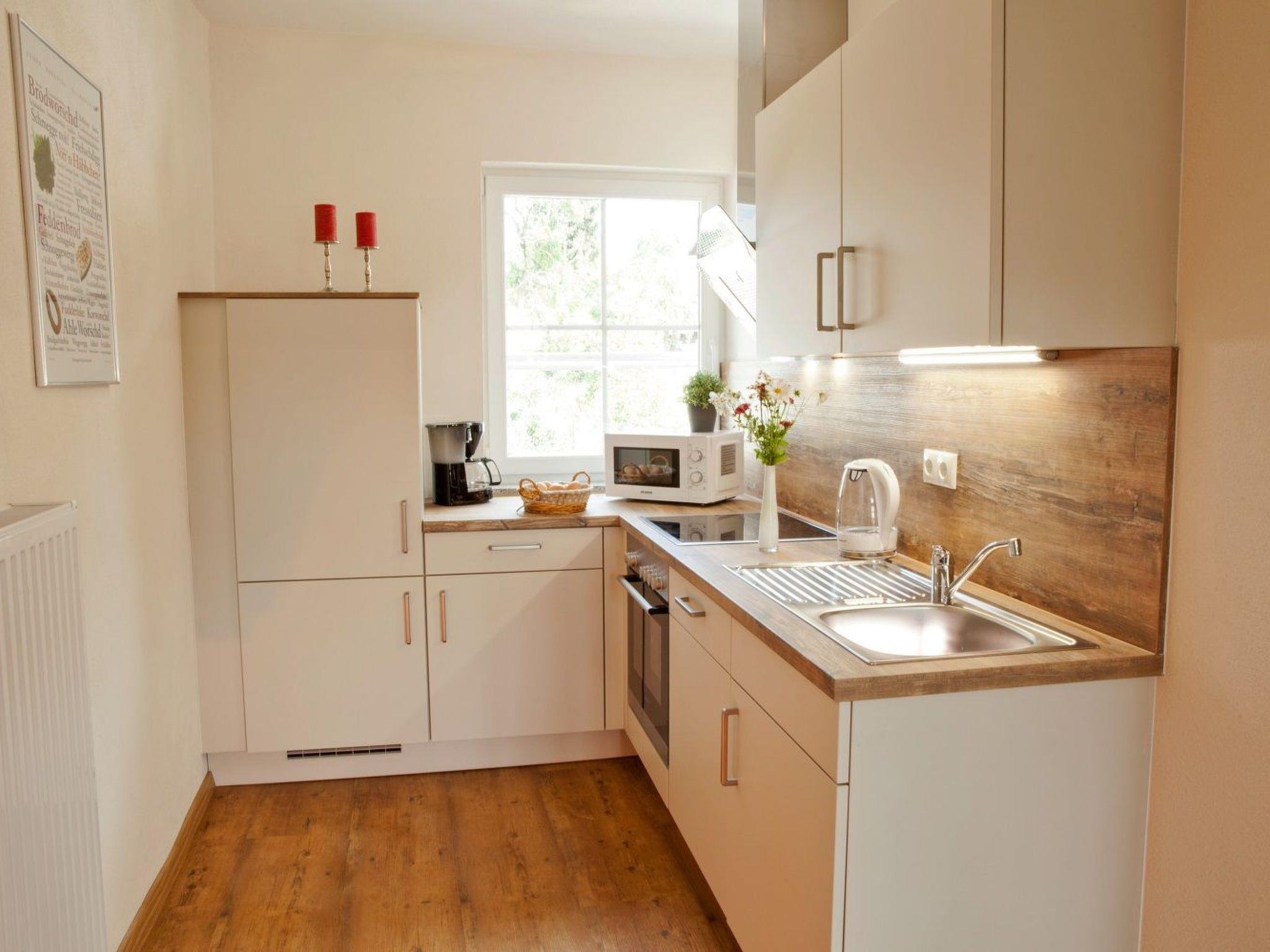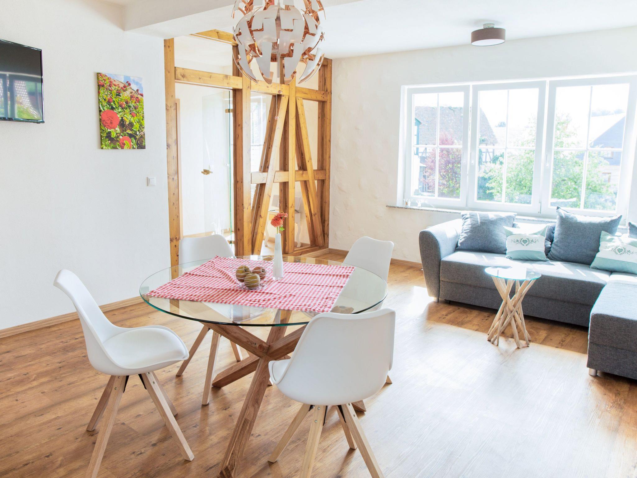 Enjoy a fairytale holiday Lovingly furnished in a mix of regional country house style and modernity - 2 bedrooms each with a double bed - cosy living/dining area - modern kitchenette - south-facing balcony Cosy living/dining area: The flat impresses with its cosy half-open living/dining area in half-timbered style. South-facing balcony: South-facing furnished balcony with a wonderful distant view of the romantic Rinnetal valley. From here you have a view of the fenced outdoor play area. The balcony door is lockable. On request, we can provide you with a baby cot and/or a high chair free of charge.