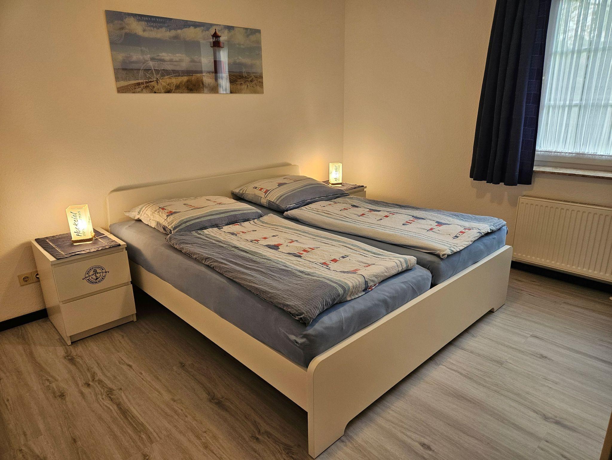 Die Erdgeschoßwohnung Langeoog verfügt über einen gemütlichen Wohnraum mit Küchenzeile sowie angrenzender Terrasse zum Garten. Weiterhin bietet sie zwei Schlafräume (eines mit Doppelbett und eines mit einem Etagenbett), ein Bad mit Dusche und einen Abstellraum. Alle Böden sind mit Laminat- und Fliesenböden ausgestattet. Flachbildfernseher, Blu-ray-Player und WLAN gehören selbstverständlich zur Ausstattung.