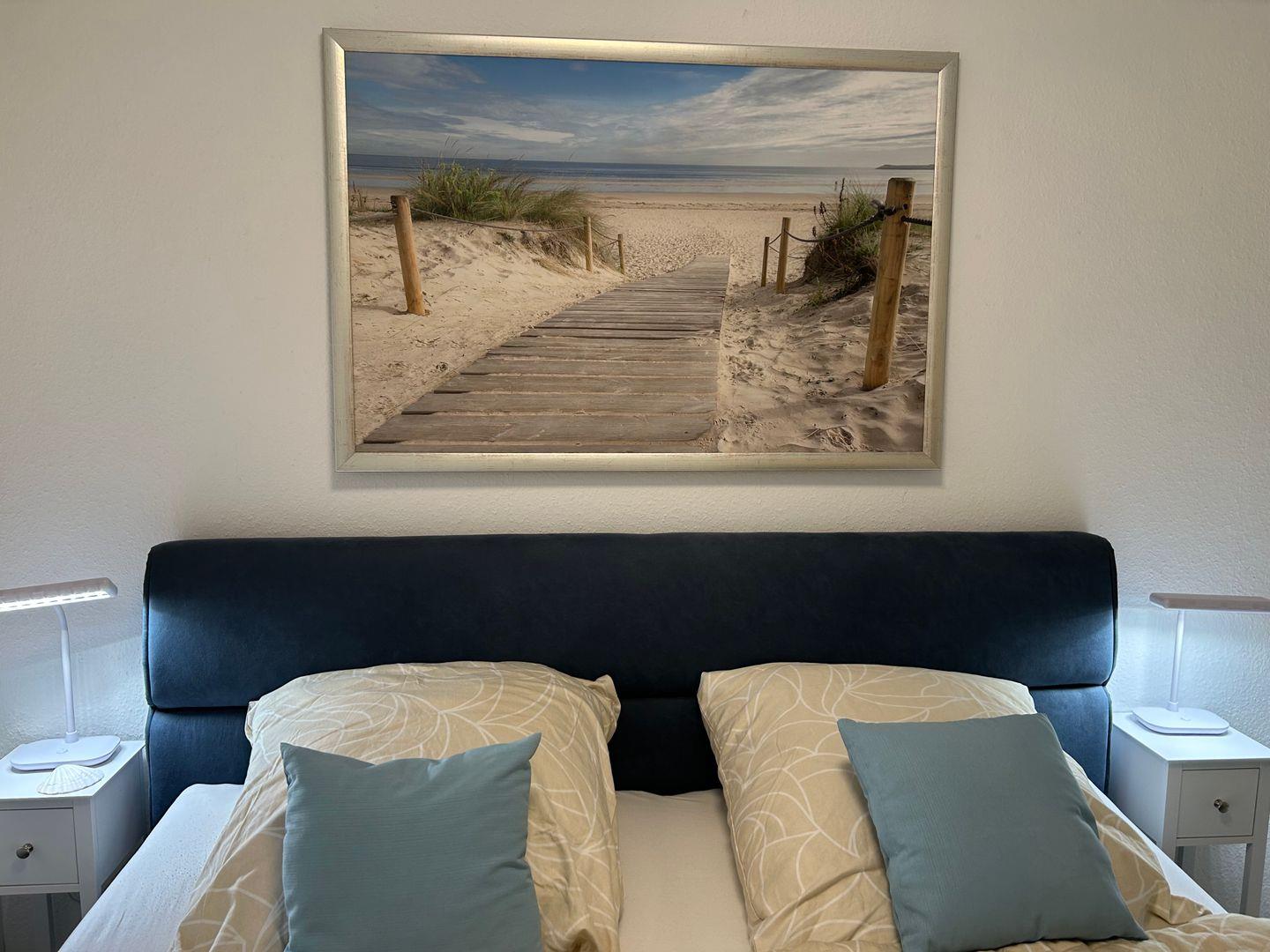 Das neu gestaltete Schlafzimmer bietet ein 1,80 x 2,00 m großes Doppelbett mit hochwertigen Matratzen und einen offenen Kleiderschrank.