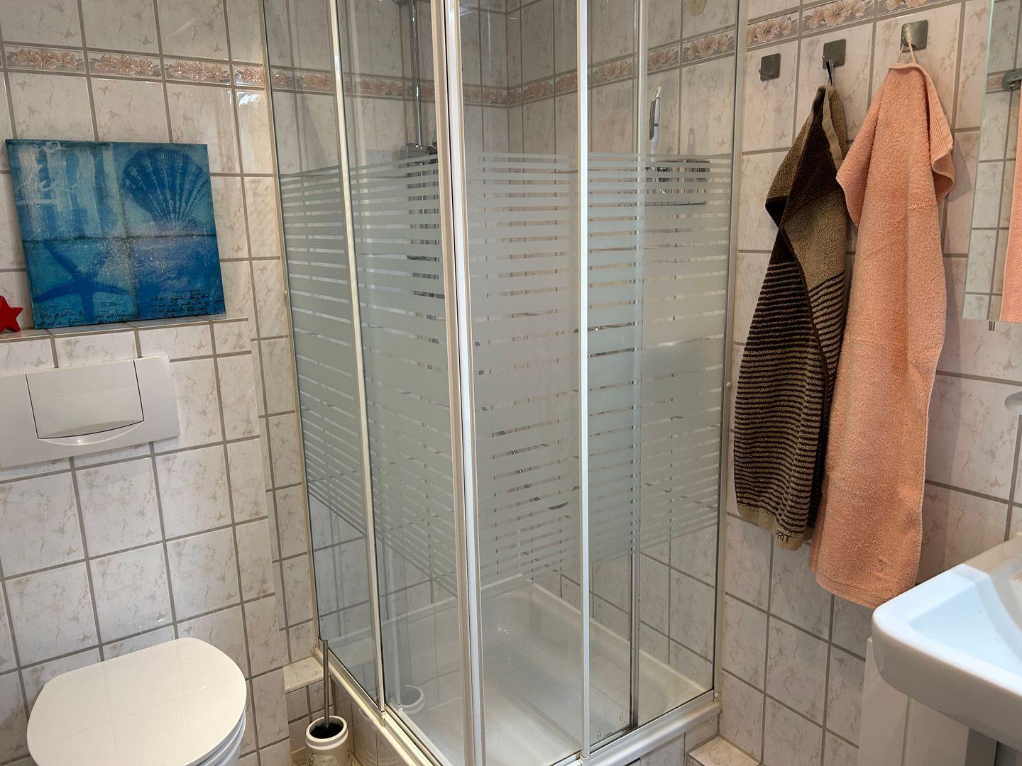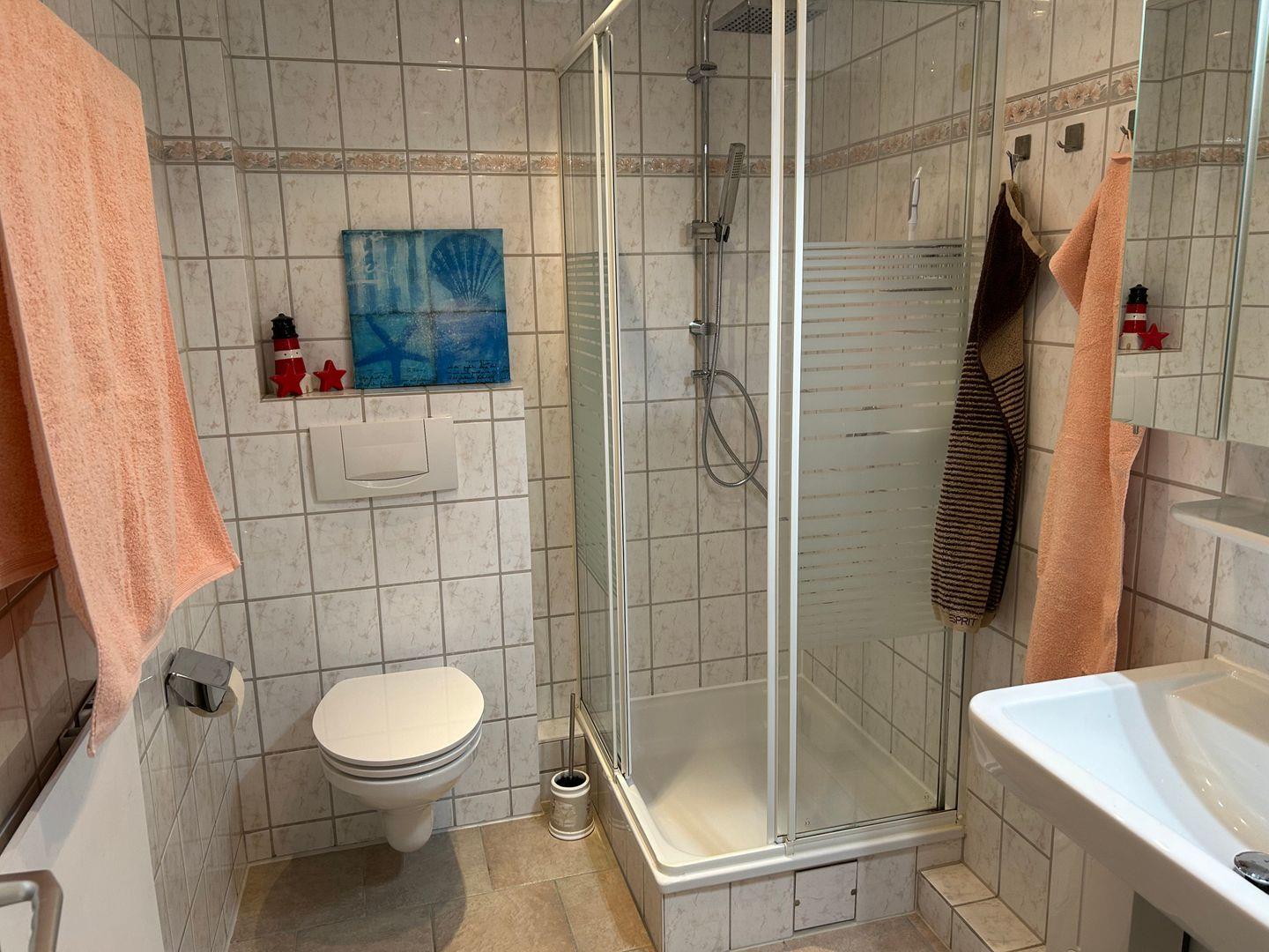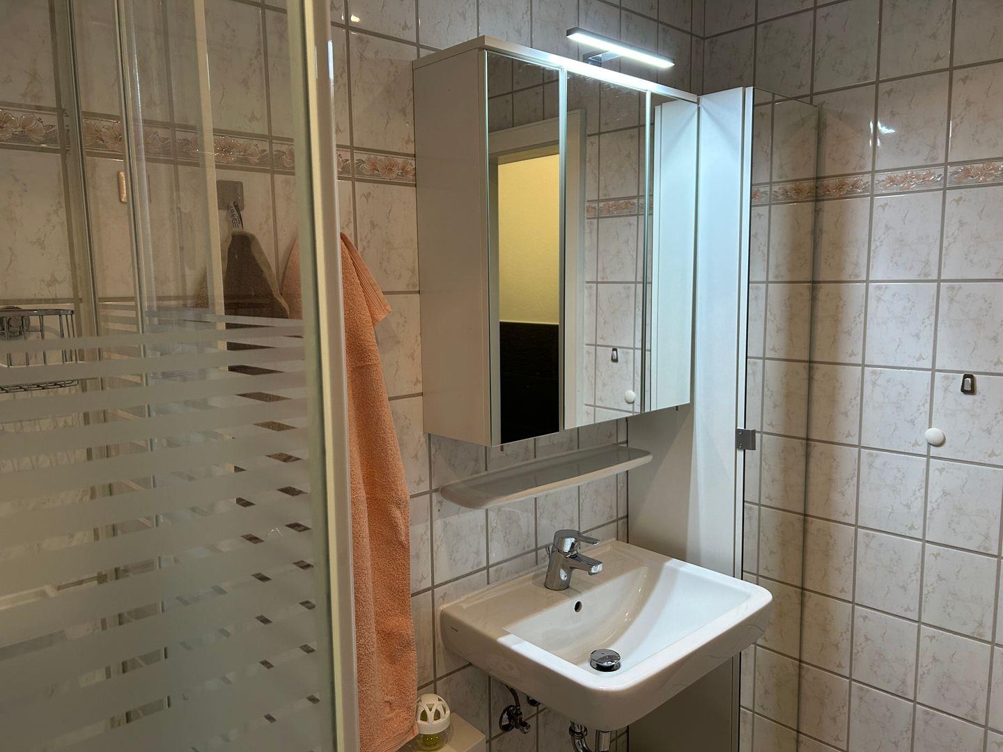 Das Bad verfügt über eine Dusche/WC, einen Föhn sowie einen großen Spiegelschrank mit ausreichend Stauraum.